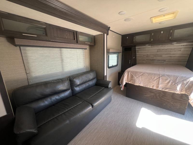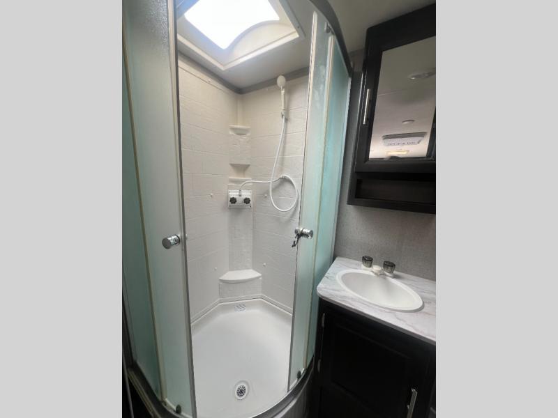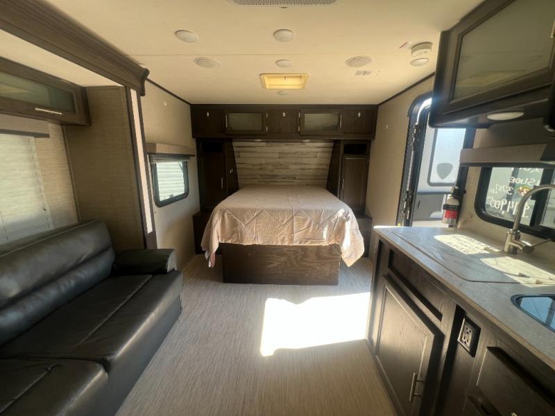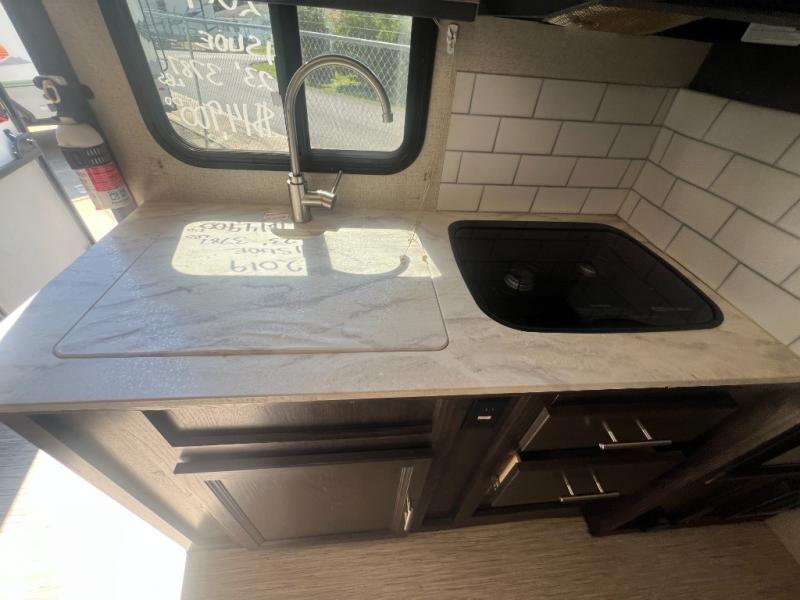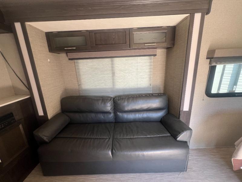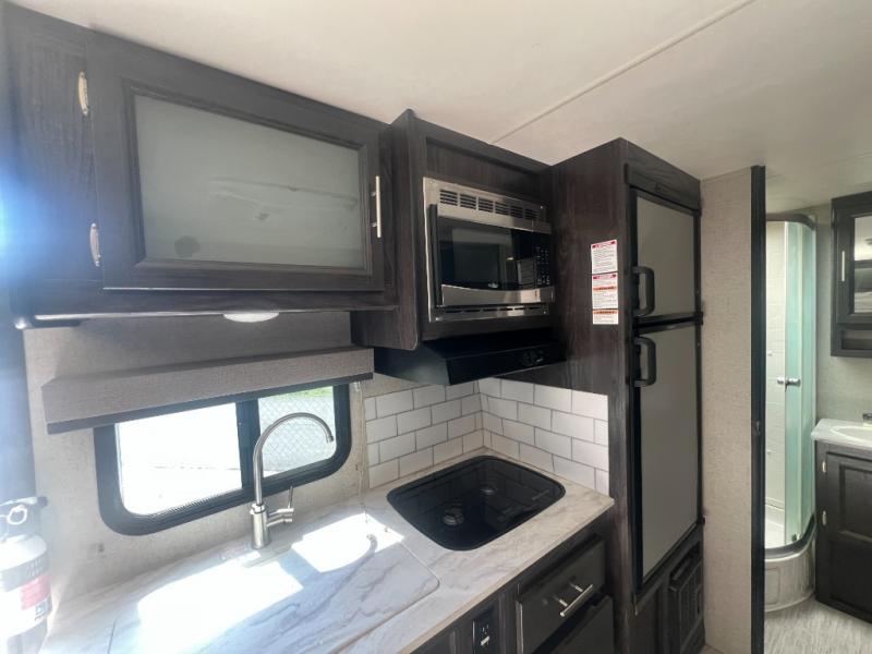 If you love spending your free time in the great outdoors, but you also enjoy the comforts of home, then you need this travel trailer that allows you to experience both of them together. During the day you can backpack through the woods or hike up the scenic mountains, and at night you can return back to enjoy a hot shower in the rear full bathroom. You might even want a hearty meal that has been cooked on the two burner range or in the microwave. Once you feel fresh and your belly is full, nothing will feel more relaxing than a good night's rest on the queen bed or sofa, and because this unit can sleep four people, everyone will wake up rejuvenated in the morning.