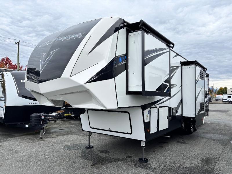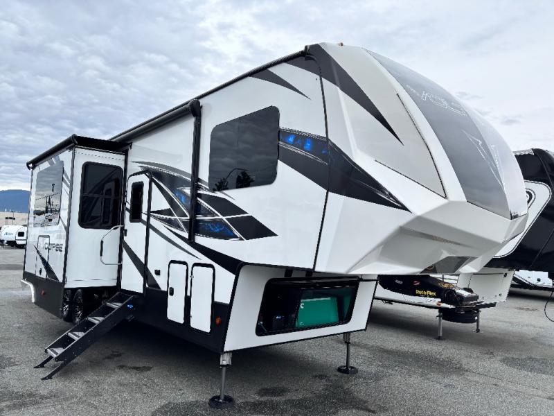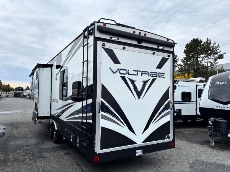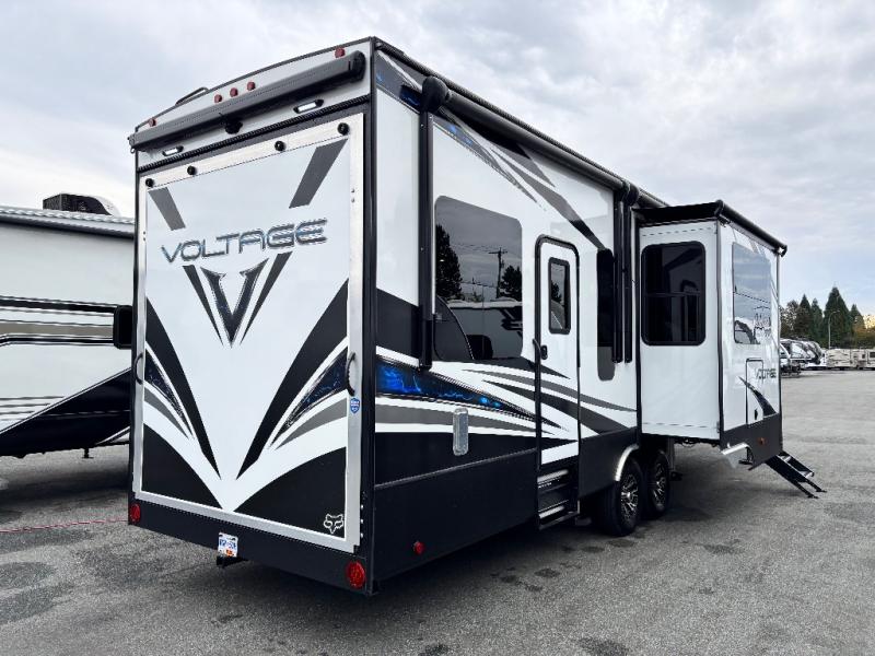 Even though the Dutchmen Voltage is the most popular fifth wheel toy hauler in its class, you don't have to own toys to want or own any one of these units. These haulers are so versatile that just having the added garage space allows you so many more camping options. Just think of how much gear you can take along for your favorite activities and outdoor games. Each rear ramp can be positioned horizontally for you to add optional awnings, screen rooms, and side rails to create a rear patio, or even a set of steps to the ground. On the inside, you will find that Voltage offers higher ceilings for a spacious open feel, residential furnishings, a gourmet kitchen with solid surface countertops, and hardwood cabinetry as well. And, with the 30 gallon gasoline fuel station, standard on every model, you can be sure that you can indeed bring all of the toys for the weekend and beyond! So, for camping that requires your favorite outdoor toys, or even a backyard patio, choose any Dutchmen Voltage FW toy hauler and begin planning your next family adventure!