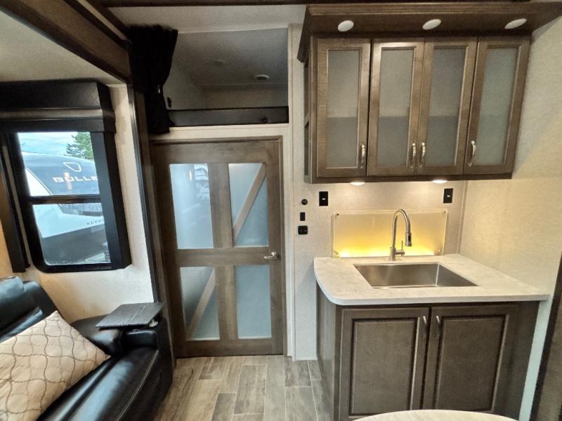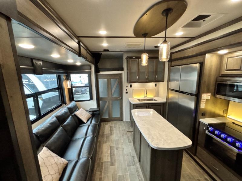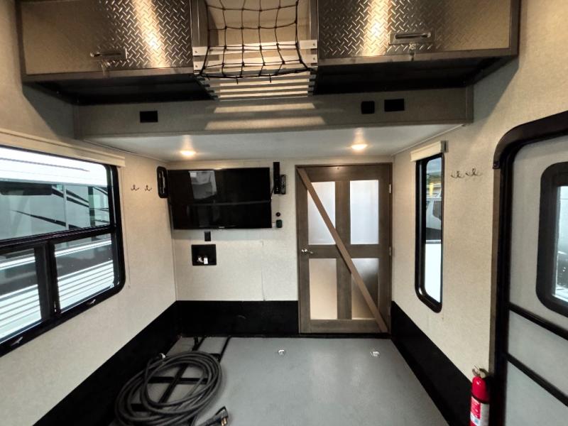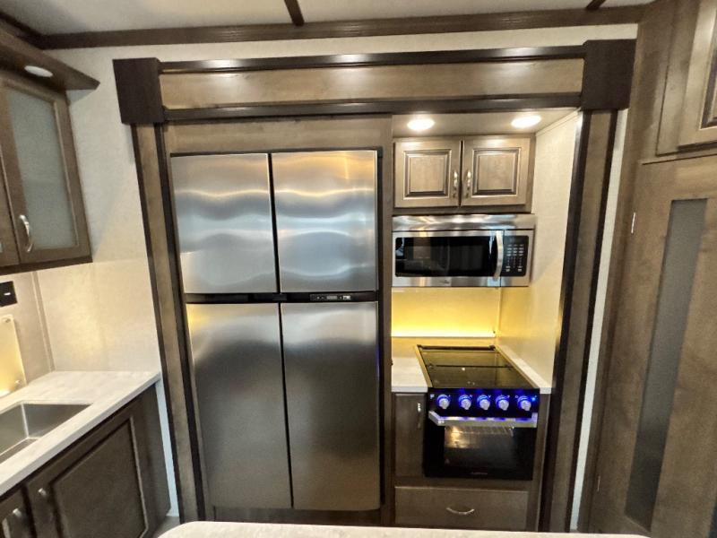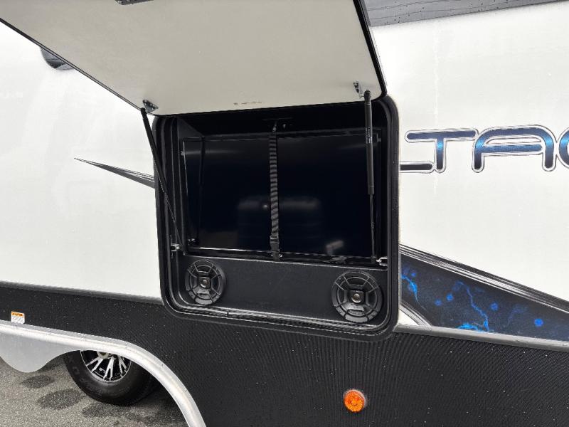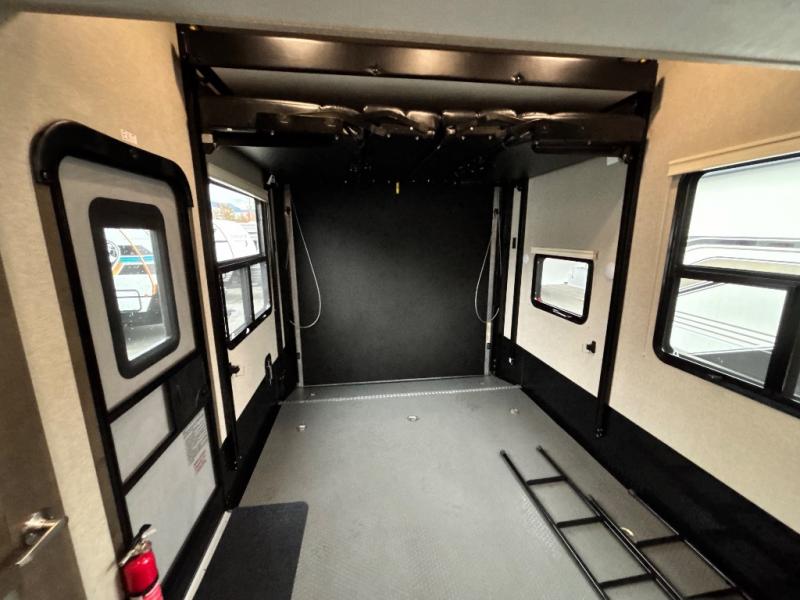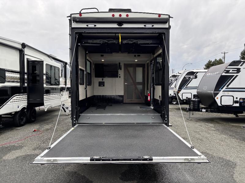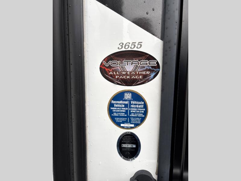 The perfect combination of adventure and at-home comforts have been combined to create an awesome home/garage on wheels! Voltage toy hauler model V3655 features a gourmet kitchen including an 18 cu. ft. refrigerator, a large kitchen island for food prep and serving, plus double slides for plenty of room in the main living/kitchen area alone. Up front you have a private bedroom with a king bed that has storage below it and a complete bath just outside of the bedroom. The lay-flat Happi-Jack power bunk with dual sofas and a twin bed loft offer ample sleeping, plus a place for the gang to hang out when they aren't out tearing up the trails. The 12' 6" garage space offers 2,500 lb. tie downs to keep your load secure while you travel, 12" of rock guard protection on the garage wall, and a side entry door near the 8' zero gravity rear ramp door that allows for quick and easy loading, plus access to all of your cargo!