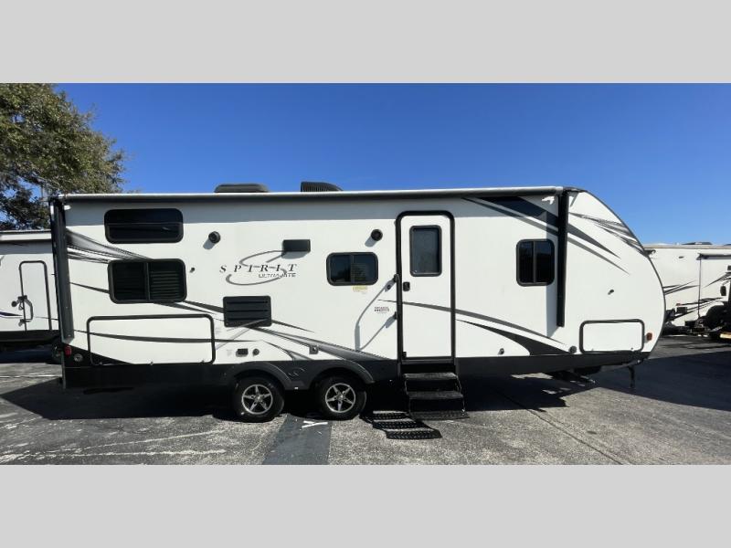Take this Spirit Ultra Lite travel trailer with you on your next camping adventure and choose whether you want to cook inside or outside! The outdoor kitchen gives you the option to grill up some burgers and hot dogs while you watch your kids run around the campground, and the three-burner range top inside lets you whip up a hearty breakfast each morning. You will love having all of the various storage compartments that have been included throughout this model, like the shoe storage, tool center, kids' convenience center, and under-the-bunk storage, and for those larger items that need a little extra space, you can use the exterior stor-more cargo and pass-through storage compartment.
