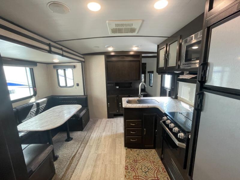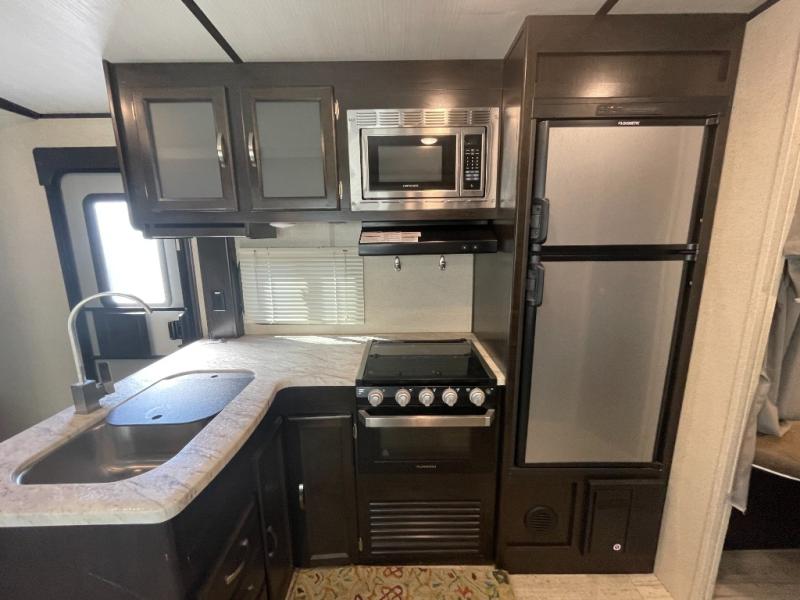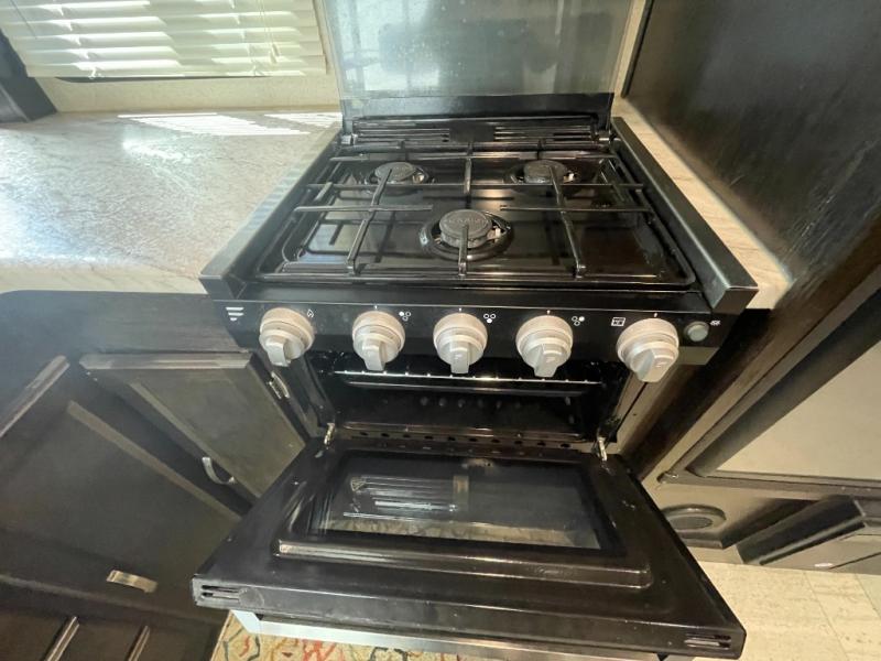 Step inside and you’ll find a bright, open interior designed for everyday use and extended travel. The kitchen area is thoughtfully laid out with practical counter space, easy-to-reach appliances, and smart storage — making it easy to prepare meals, serve snacks, or pack lunches for your next adventure. The dinette doubles as additional sleeping space, adding flexibility when you need it most.