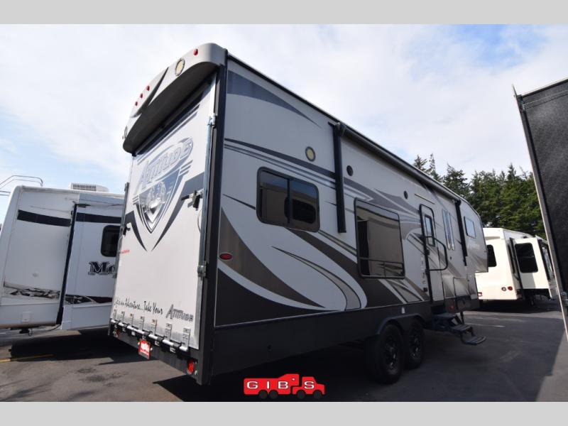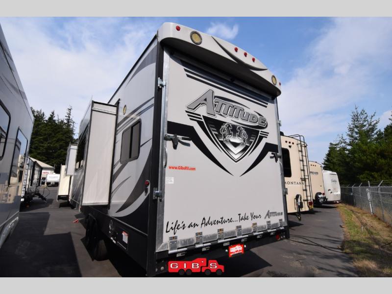 With the Eclipse Attitude Wide Lite toy hauler fifth wheel you can camp in comfort and style! Along the outside there is a 40 gallon fuel station so you can keep the fun going all weekend long! There is a gray fiberglass front cap with LED lights and gray fiberglass sidewalls. The ramp door with cables have a 3,000 lb rating so you can easily load your toys of choice. Inside you will find an electric bed, a lighted solid surface galley top, a drop range with glass cover, and a pillowtop mattress with bedspread and shams. In the galley and bedroom you will also find a USB charger and more!