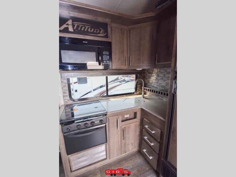 With 12'4" of roadside cargo space and 16'5" of curbside space you can easily load up your off-road toys and head out to the campground of your choice with this Attitude Wide Lite 28SAG toy hauler travel trailer. After your gear is unloaded then you can lower the electric bed. In the evening plan to sit for a while and visit at the sofa or the two lounge chairs. If you prefer a bit more floor space then you may want to add the optional slide out. Meal prep is easy in this kitchen, and at night head up the stairs to the private front bedroom where you will find a queen bed and plenty of storage with the wardrobes and overhead cabinet, plus more!