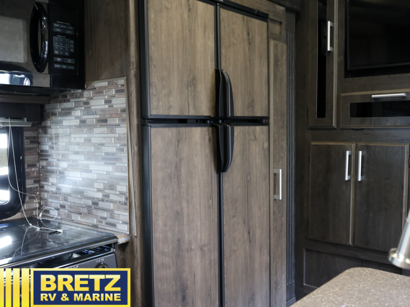 Step inside this Attitude Widebody 35GSG toy hauler and see just how much fun you will have on your next getaway! It features a front private bedroom with a pillowtop king mattress, a wardrobe and a dresser to keep your clothes neat and tidy, as well as an entrance into the dual entry bath which will come in very handy at night. You will find entertainment inside and outside with the 50" TV in the living room and the exterior 40" TV, plus there is an electric awning with LED lights. After you have whipped up your best meal in the complete kitchen, you can enjoy it at either the dinette below the electric bed or one of the two chairs with a table in between, and if you dare to be brave you can even eat on the sofa!