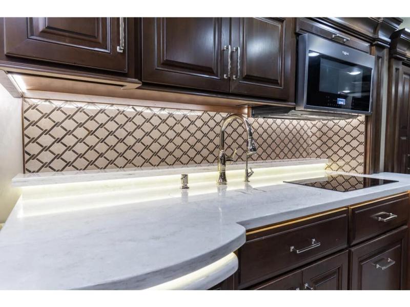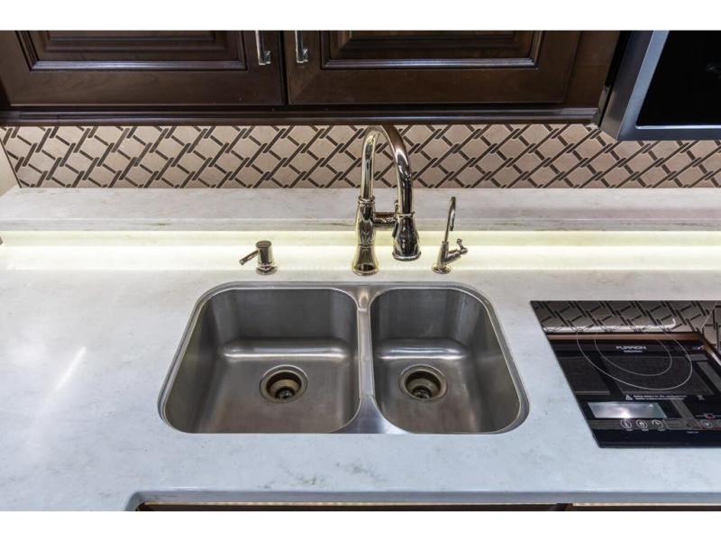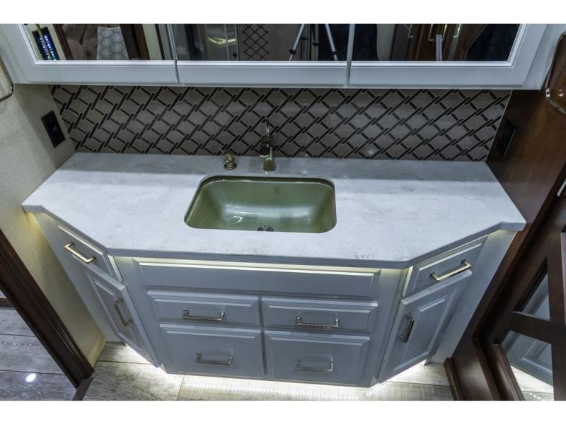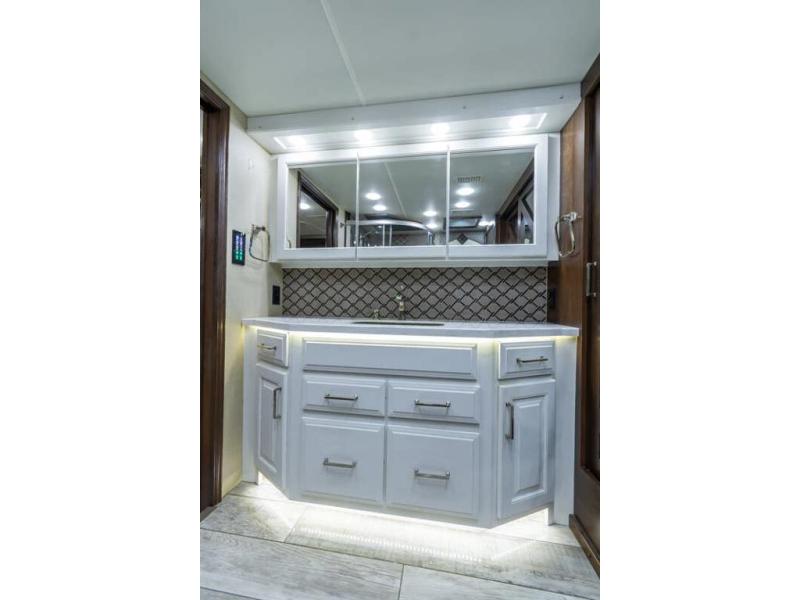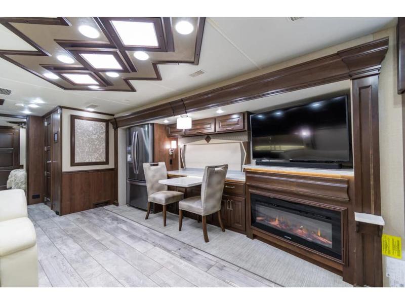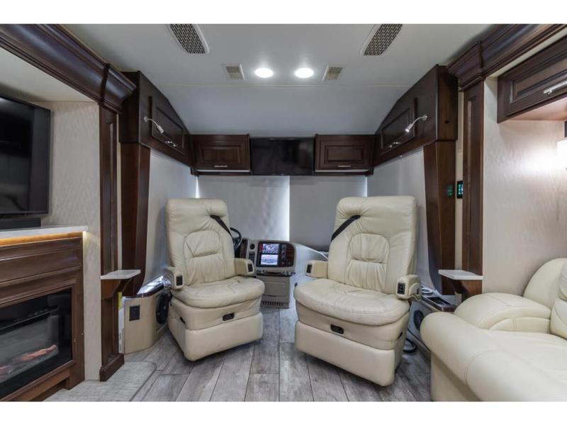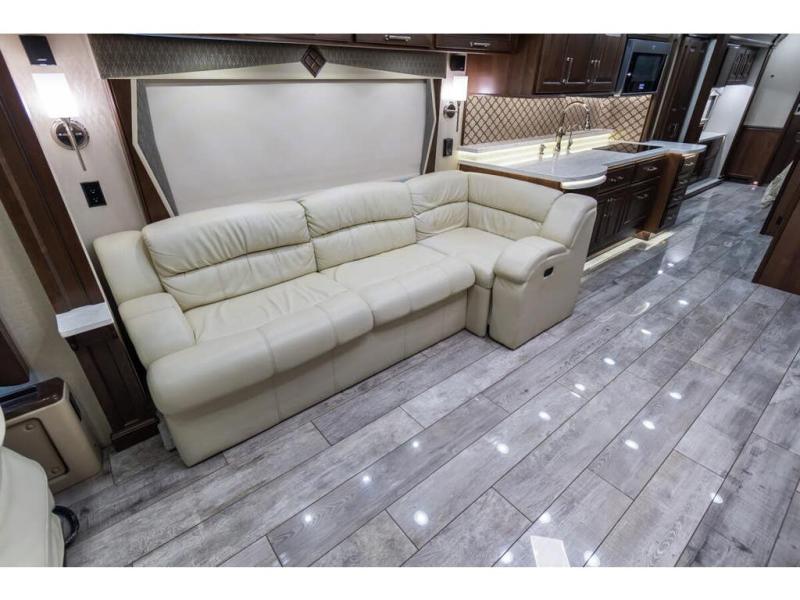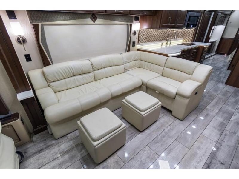 It's time to enjoy the ride as much as the destination in this Anthem coach. From the 6-way power Ultraleather cab seats to the porcelain tile backsplash with glass design inlays and the solid surface countertops with dimmable LED accent lighting, you will enjoy every time that you take this coach out of storage. You can relax on the L-shaped sofa/hide-a-bed with two ottomans while watching the 50" TV with fireplace below or sit at the free standing dinette. The full kitchen and residential refrigerator allow you to make meals if you like and load up on food and drinks for any trip. You might even enjoy being outside in the outdoor living area created by the awning, entertainment center and 40" TV. No worries about staying clean and refreshed with the large full bathroom which includes a washer and dryer, plus there is a half bath mid-coach. Step inside to luxury and comfort!