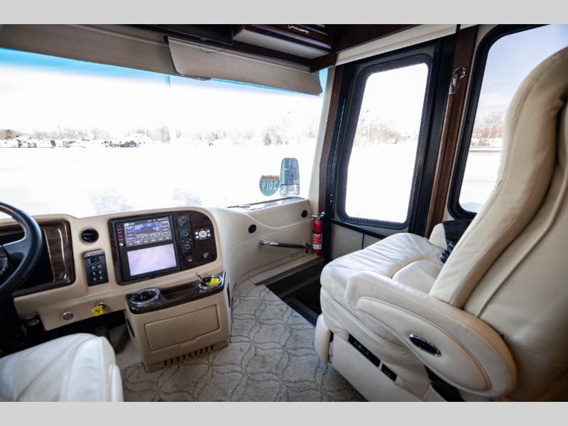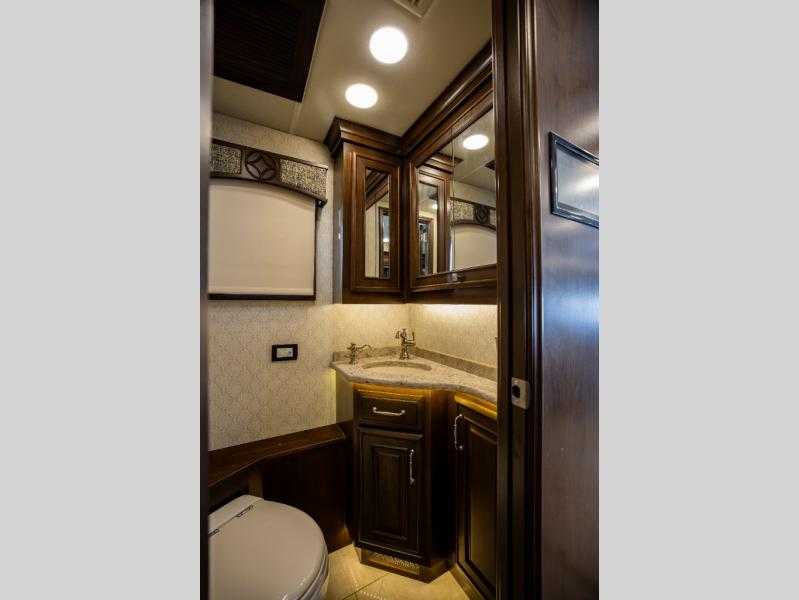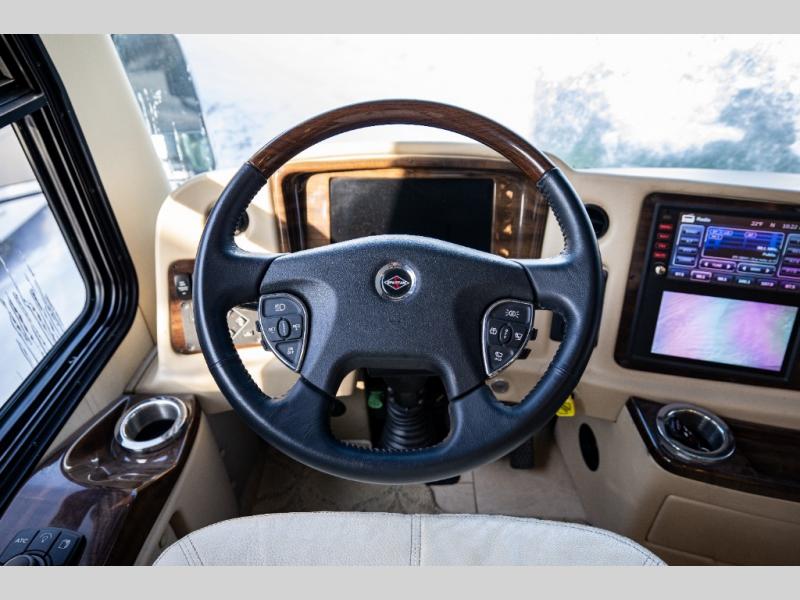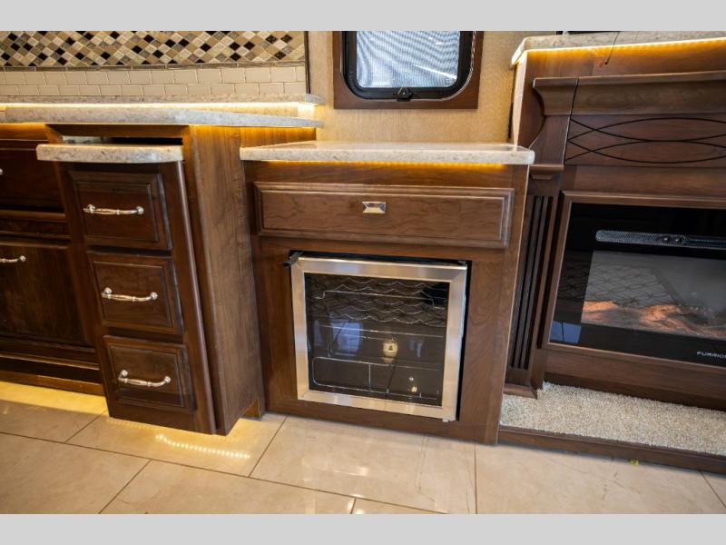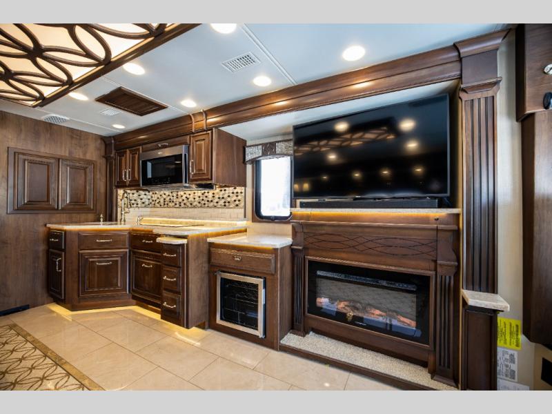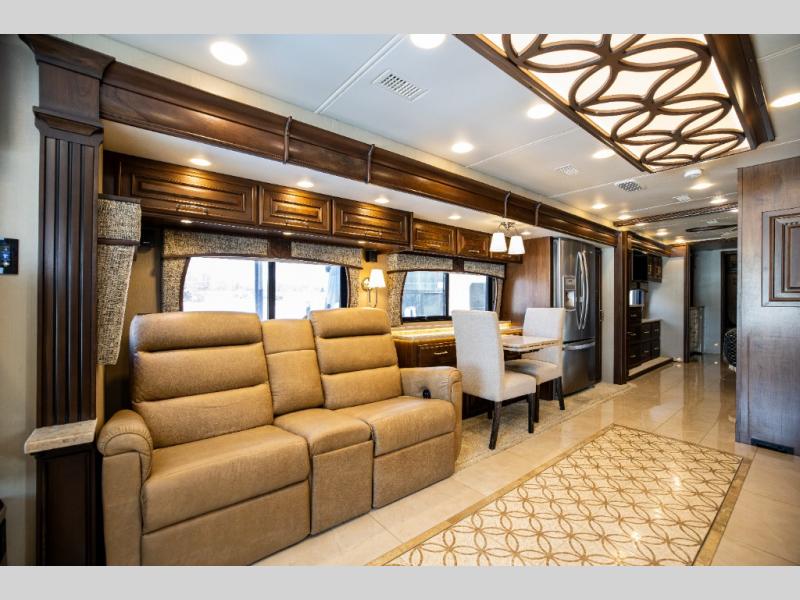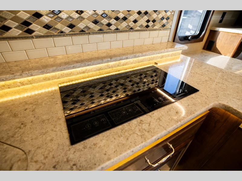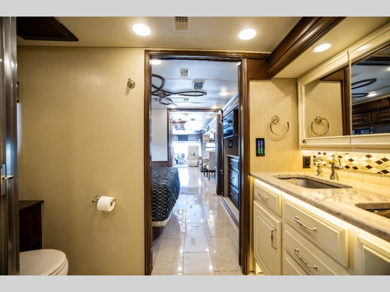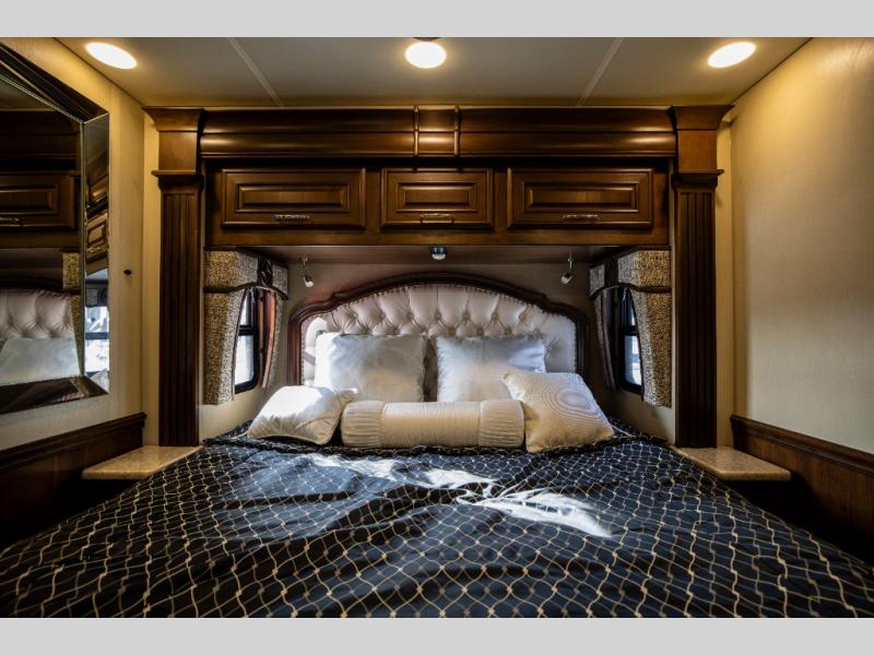 This Cornerstone 45F class A diesel coach allows you to travel in comfort, style and luxury with all the amenities needed, plus some! You can prop your legs on the ottomans while relaxing on the sofa and watching the 50" TV on a lift, and set up the hide-a-bed to take a nap if you like. The chef will enjoy making meals in the convection microwave oven and induction cooktop when you aren't in town having dinner. Just imagine your friends' expressions when they see the Quartz countertops with dimmable LED accent lighting and porcelain tile backsplash with glass design inlays and a ceramic border. You will get a good night's rest on the Select Comfort sleep number mattress, be able to charge your electronics with the USB ports on the solid surface nightstand tops, and stay cool from the ceiling fan while watching the TV. The full bathroom offers his and her sinks allowing two people to get ready at the same time, and a rear full closet includes a washer and dryer and plenty of storage. There is an additional living area outdoors under the awning with an exterior 40" TV. Take a look today!