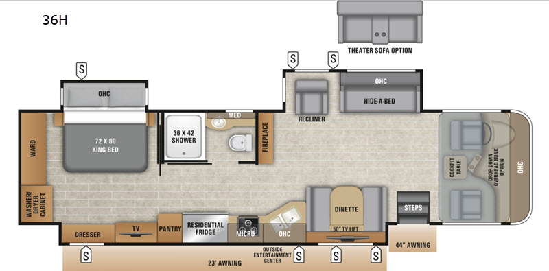 You're going to love traveling in this Entegra Emblem 36H class A motorhome! It has features to make you feel right at home like the 50" TV on a lift above the booth dinette and two Blu-Ray players, plus the vinyl flooring will make spills easier to clean. Inside the rear private bedroom, you will enjoy a good night's rest on the king bed plus there is a dresser, a TV, a wardrobe, and an optional washer/dryer that can be added to the cabinet. You can easily whip up your best meals in the kitchen and store your favorite snacks inside the pantry and delicious leftovers inside the 21 cu. ft. residential refrigerator. If you need more sleeping spots, then simply add the drop down bunk option above the cockpit!