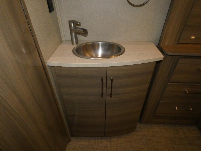 With this Entegra Coach motorhome, you will be able to experience luxury like never before with indulgent amenities like the high-intensity, recessed LED ceiling lights which add an extra touch of ambiance to the entire coach, and from the moment you step foot into this unit, you will notice the woven vinyl flooring that brings the entire decor scheme together in an elegant fashion. During the day you can adjust the level of sunshine you want streaming into this unit with the help of the day/night roller shades that are included on all of the windows throughout this model, and if you prefer to spend your evenings outdoors gazing up at the night sky, then you can comfortably do so underneath the electric awning with LED lights.