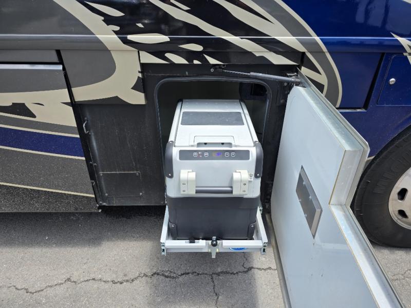 Imagine driving down the road on Ultra-Leather captain's chairs and furniture while enjoying the view out the windows of this diesel coach. Your grandkids are probably planning all their adventures once you get set up at the RV park. This unique layout offers bunk beds in the rear with wardrobe and linen storage as you walk through the master bedroom and full bathroom. You can enjoy your own Encore Series king bed while watching TV or even washing clothes in the side-by-side appliances. The half bath is conveniently mid-coach for those quick breaks, and there is plenty of furniture for relaxing, dining and extra sleeping space when the relatives join you. Don't forget about the outside 48" TV and electric awning when you want to enjoy the weather and watch the grandkids run around. You will find more features that provide luxury and convenience, step inside!