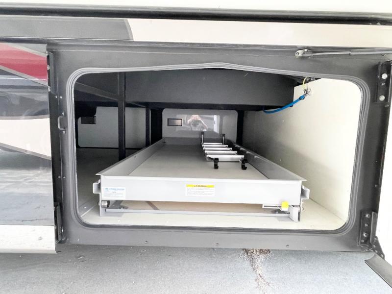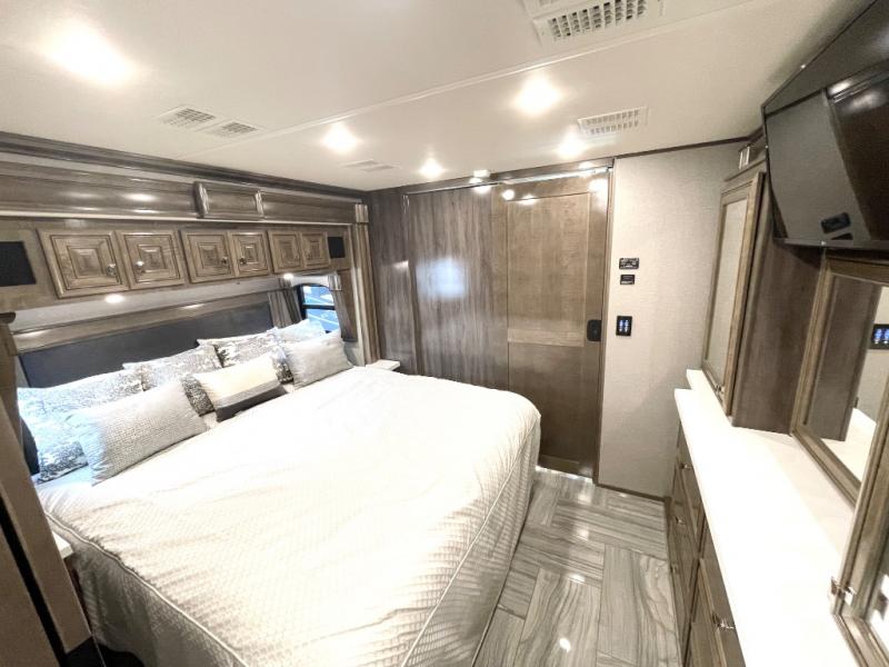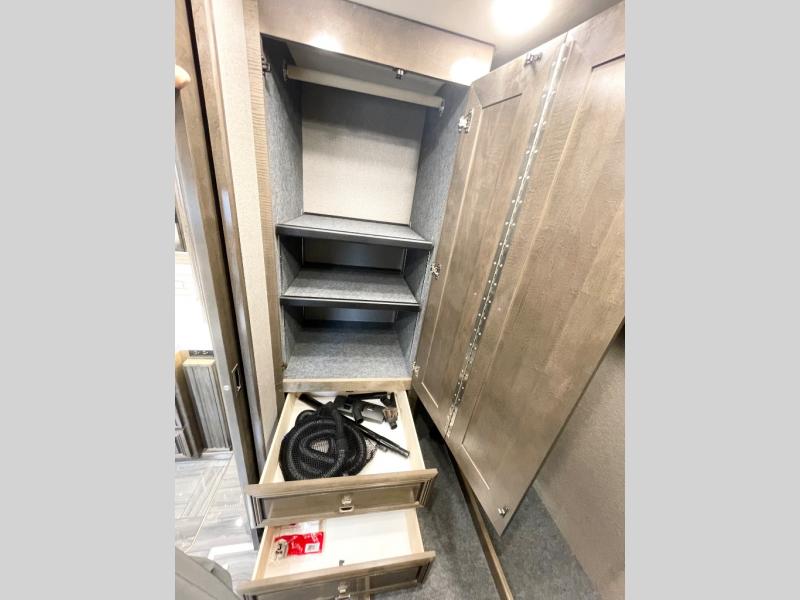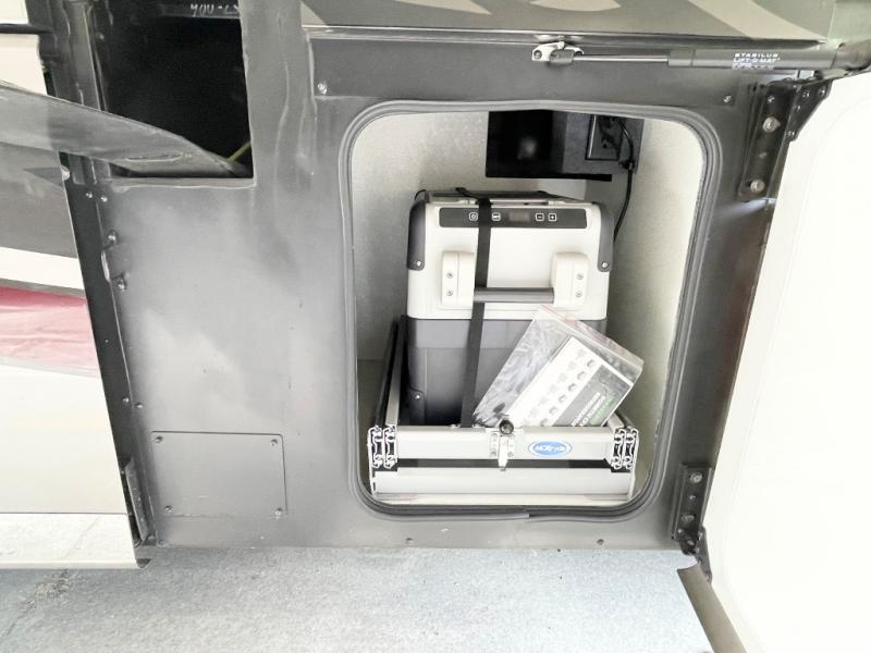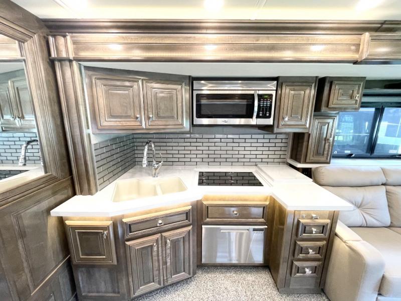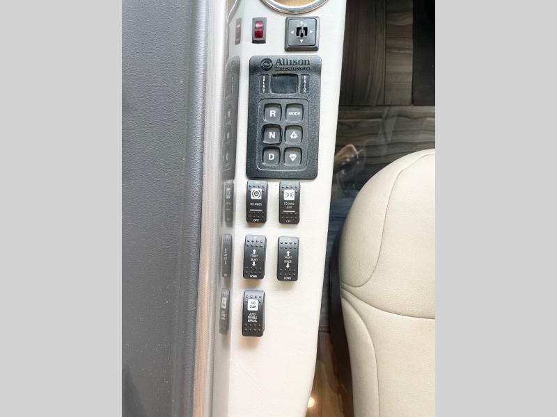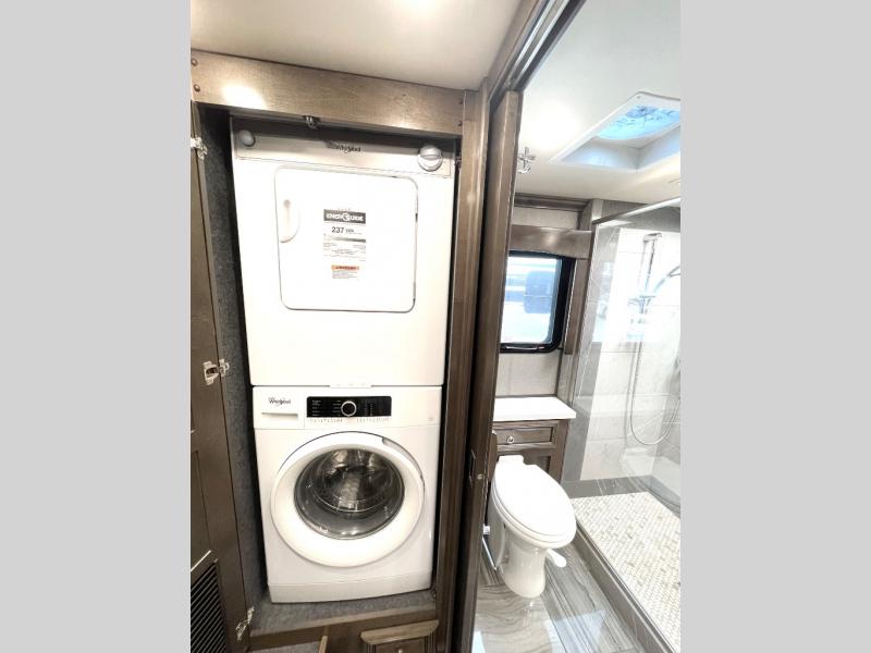 You can probably envision yourself and your family driving down the road on Ultra-Leather captain's chairs and on the furniture while enjoying the view out the windows of this diesel coach. Your grandkids are probably planning all their adventures once you get set up at the RV park. This unit offers a large closet in the full bathroom with a washer and dryer, linen storage, and a shoe rack, plus a full length wardrobe. You can enjoy your own Encore Series king bed while watching TV or even washing clothes in the side-by-side appliances. The half bath is conveniently mid-coach for those quick breaks, and there is plenty of furniture for relaxing, dining and extra sleeping space for the relatives. Don't forget about the outside 48" TV and electric awning when you want to enjoy the weather and watch the grandkids run around. You will find more features that provide luxury and convenience, step inside!
