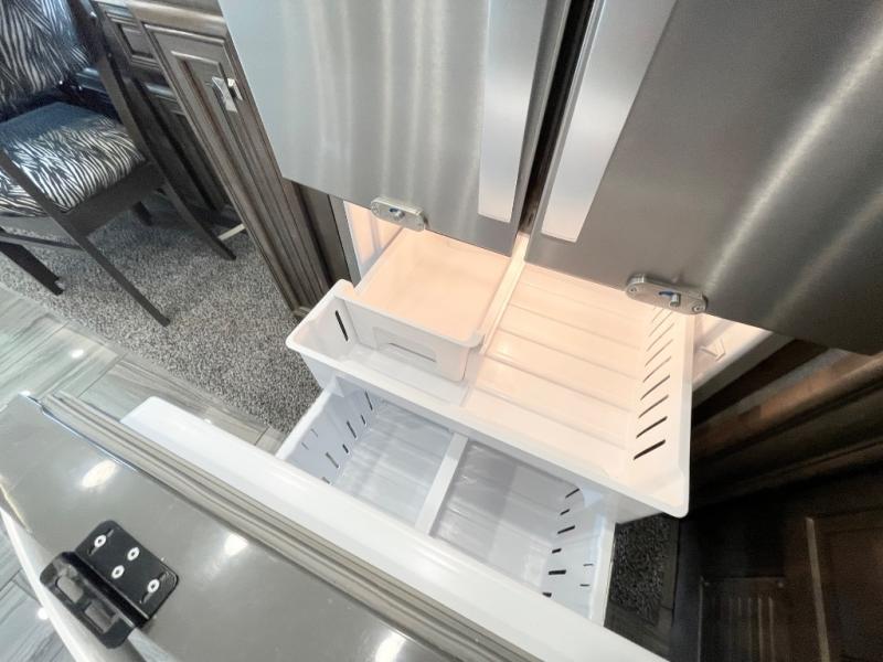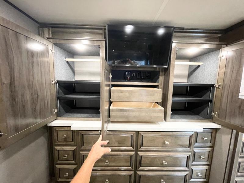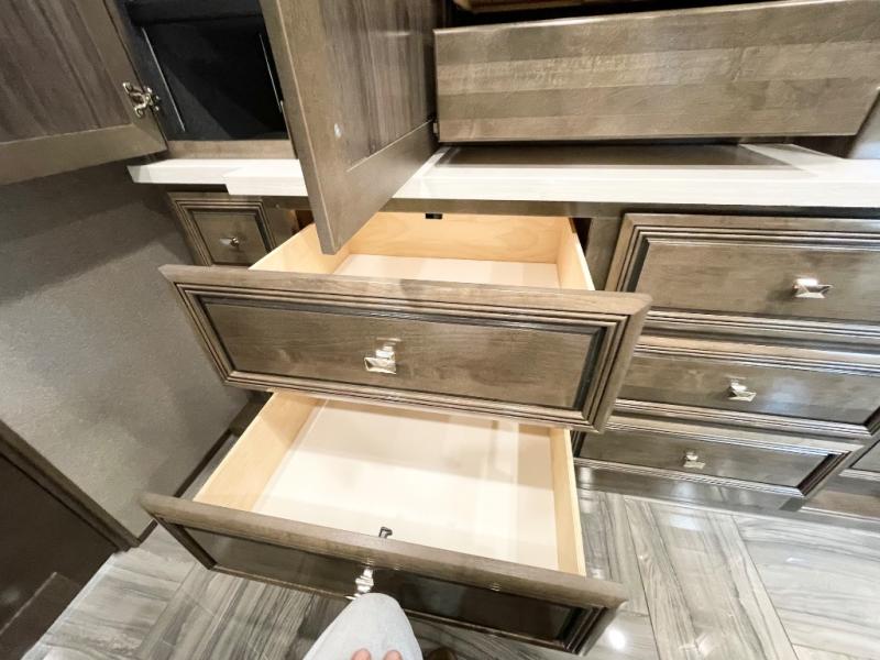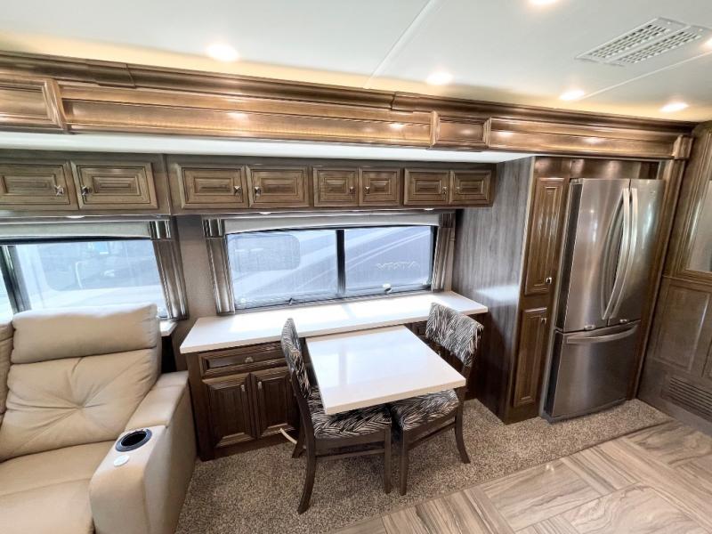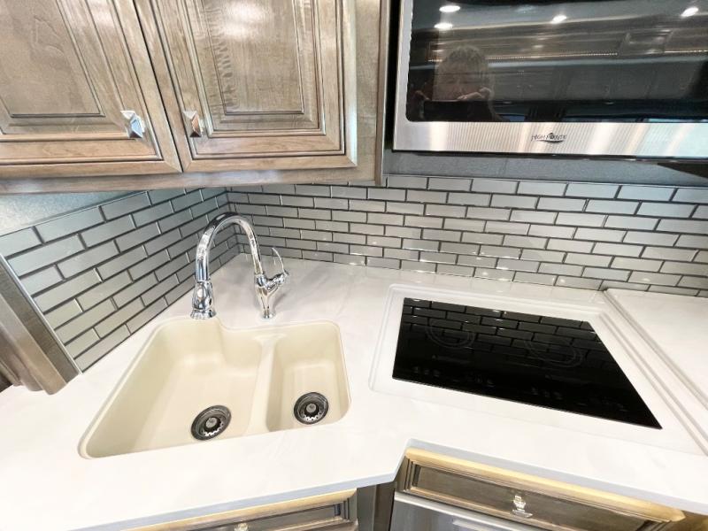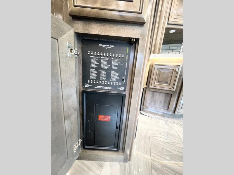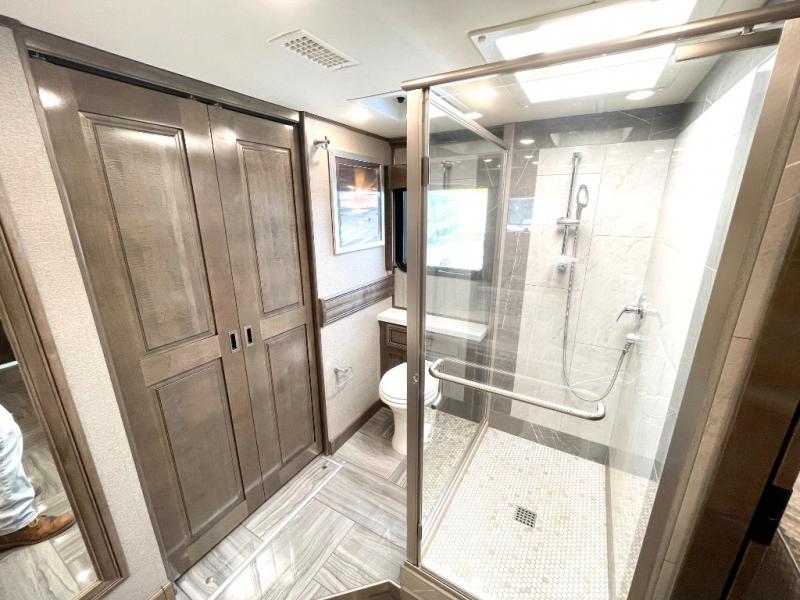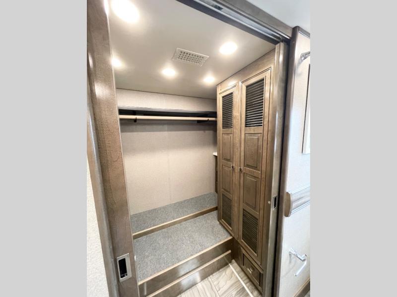 You can probably envision yourself and your family driving down the road on Ultra-Leather captain's chairs and on the furniture while enjoying the view out the windows of this diesel coach. Your grandkids are probably planning all their adventures once you get set up at the RV park. This unit offers a large closet in the full bathroom with a washer and dryer, linen storage, and a shoe rack, plus a full length wardrobe. You can enjoy your own Encore Series king bed while watching TV or even washing clothes in the side-by-side appliances. The half bath is conveniently mid-coach for those quick breaks, and there is plenty of furniture for relaxing, dining and extra sleeping space for the relatives. Don't forget about the outside 48" TV and electric awning when you want to enjoy the weather and watch the grandkids run around. You will find more features that provide luxury and convenience, step inside!