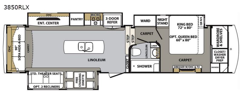 In any Cardinal Luxury fifth wheel you will find comfort and conveniences both inside and out as these units were built with your enjoyment in mind. Each unit features an all welded aluminum super structure frame and includes an Alpha Super Flex II TPO roof. Each Cardinal Luxury model is also 100" wide along with three to five slides to provide you with maximum space inside for 100% enjoyment with your family and friends. You will love the cathedral ceilings for added interior height, cedar lined closets to keep all of your clothing smelling as fresh as the outdoors, and beautiful Beauflor flooring that is backed by a 7 year cold crack warranty. You will also appreciate the at-home touches inside that give each unit a luxurious feel like crown molding ceiling and cabinet trim, wainscoting, and pendant lighting in the kitchen area. The outside of each coach also has a high end look with its premium high-gloss gel coat fiberglass that you have the option of choosing in one of four full body paint color schemes!