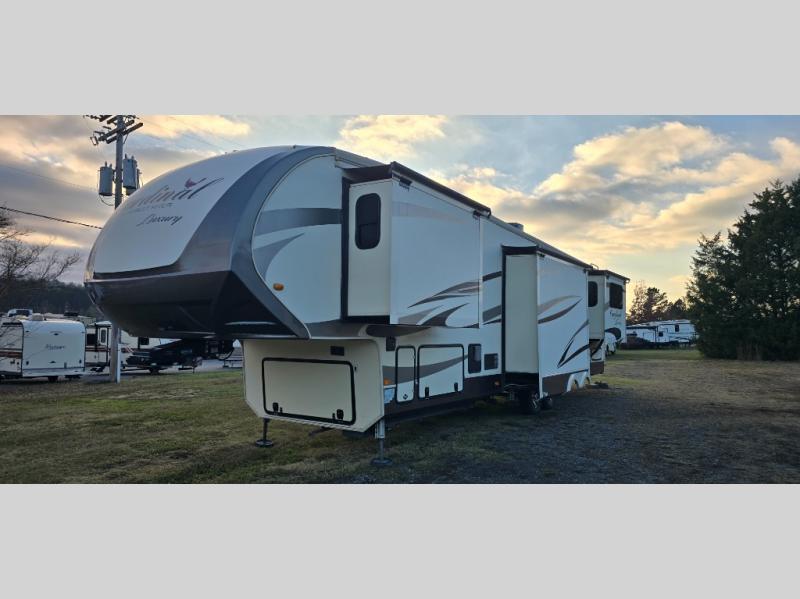 In any Cardinal Luxury fifth wheel you will find comfort and conveniences both inside and out as these units were built with your enjoyment in mind. Each unit features an all welded aluminum super structure frame and includes an Alpha Super Flex II TPO roof. Each Cardinal Luxury model also has a wide body construction along with three to five slides to provide you with maximum space inside for 100% enjoyment with your family and friends. You will love the cathedral ceilings for added interior height, plenty of closets to keep all of your clothing, and beautiful Shaw lino throughout. You will also appreciate the at-home touches inside that give each unit a luxurious feel like the crown molding ceiling and cabinet trim, an electric fireplace, and pendant lighting in the kitchen area. The outside of each coach also has a high end look with its premium high-gloss gel coat fiberglass that you have the option of choosing in one of four full body paint color schemes!