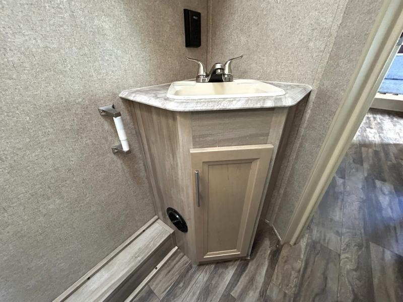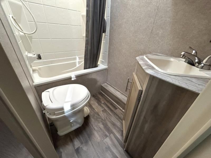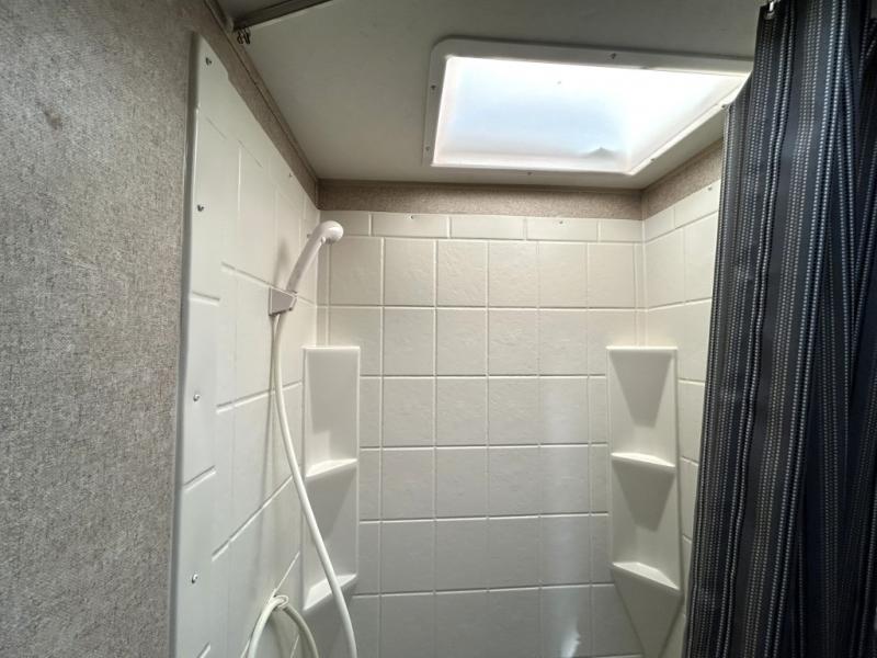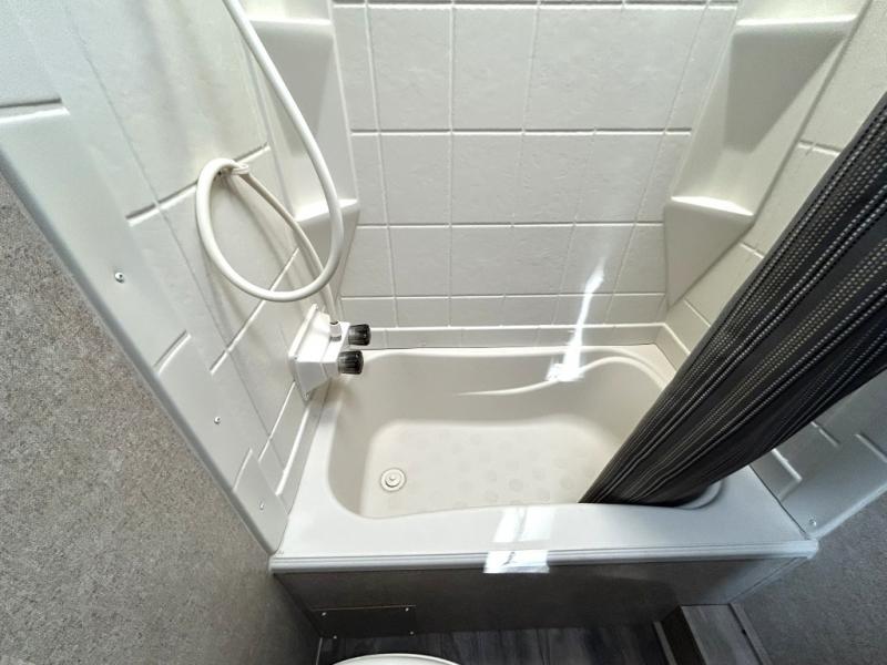 Stay fresh and clean with an easy-access bathroom featuring a shower and toilet right next to the bunks for ultimate convenience. -