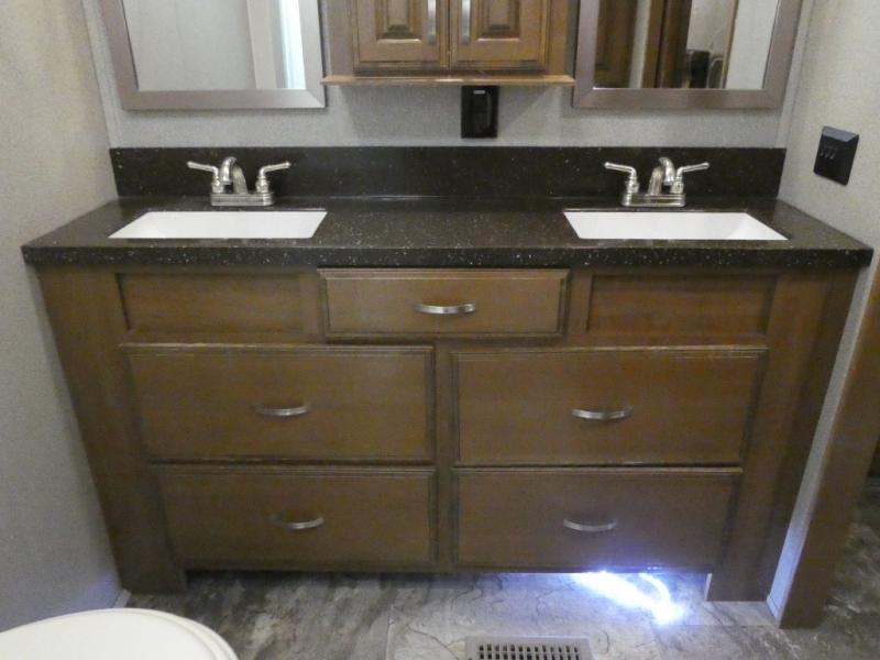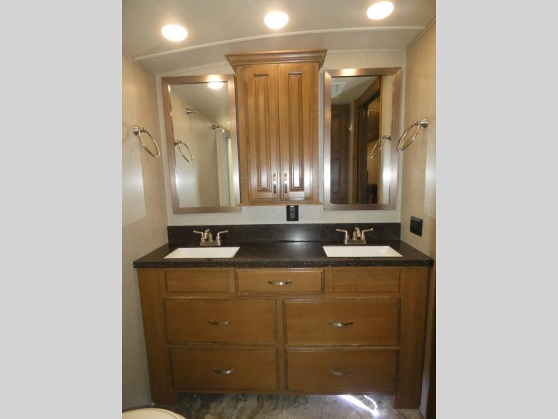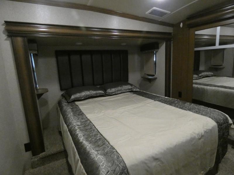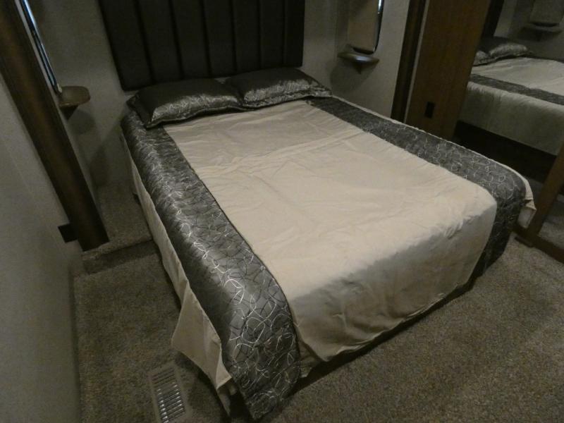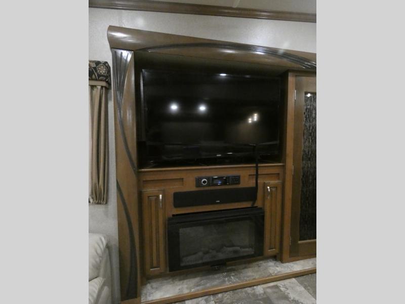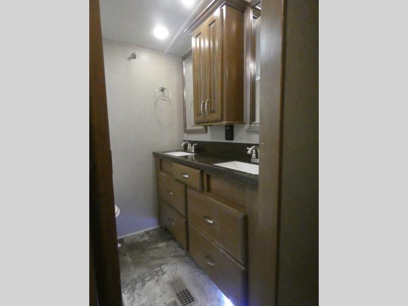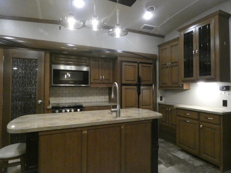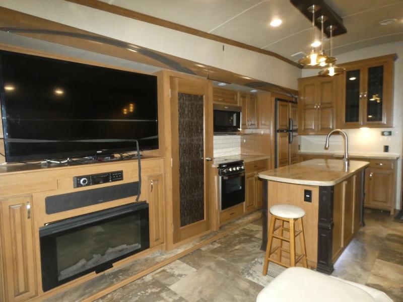 Imagine camping in your own fifth wheel at your favorite campground once a month or traveling to see new places. You don't have to leave any amenities behind when you have this model with you. In the kitchen there is plenty of work space to prepare meals when you aren't cooking over the campfire. Clean up is a breeze at the center island with the double sink. You will love the views out the panoramic window and while looking at the fireplace underneath the 50" LED TV. When you are ready to call it a day, then head up the steps to the full bathroom with Jack and Jill sinks including a full wall, back-lit mirror to the private front bedroom. The Denver king bed, and storage in the large wardrobe and a dresser should accommodate all your needs.