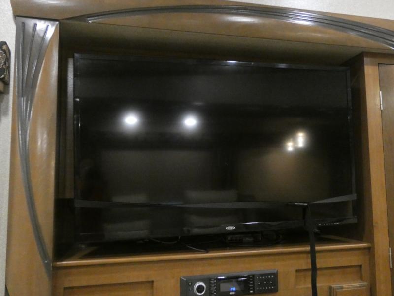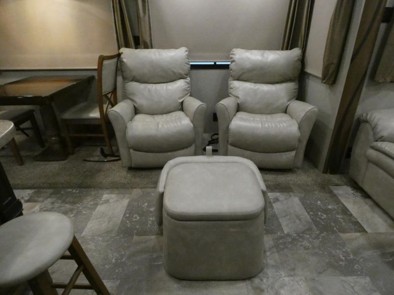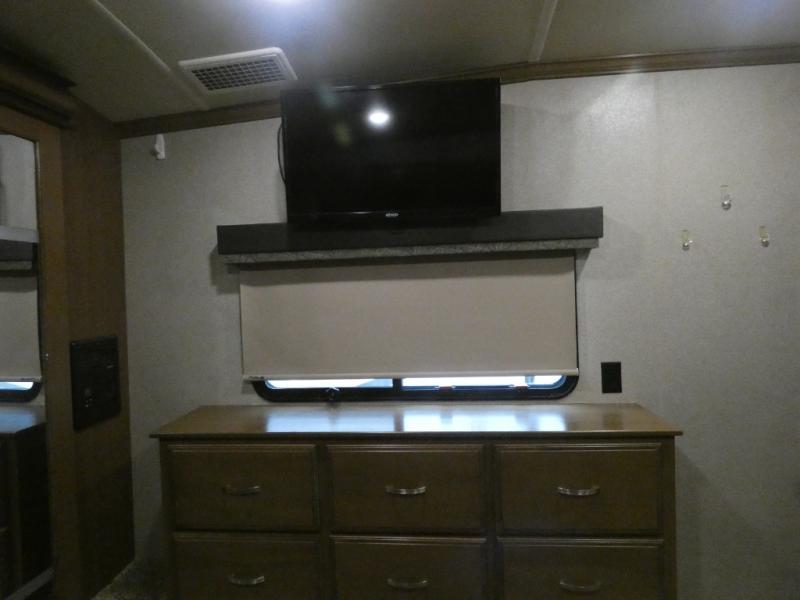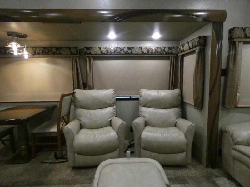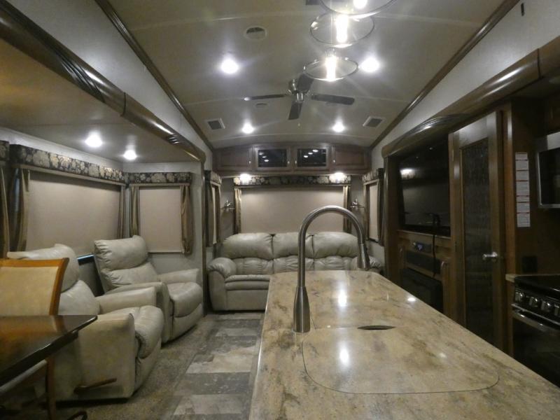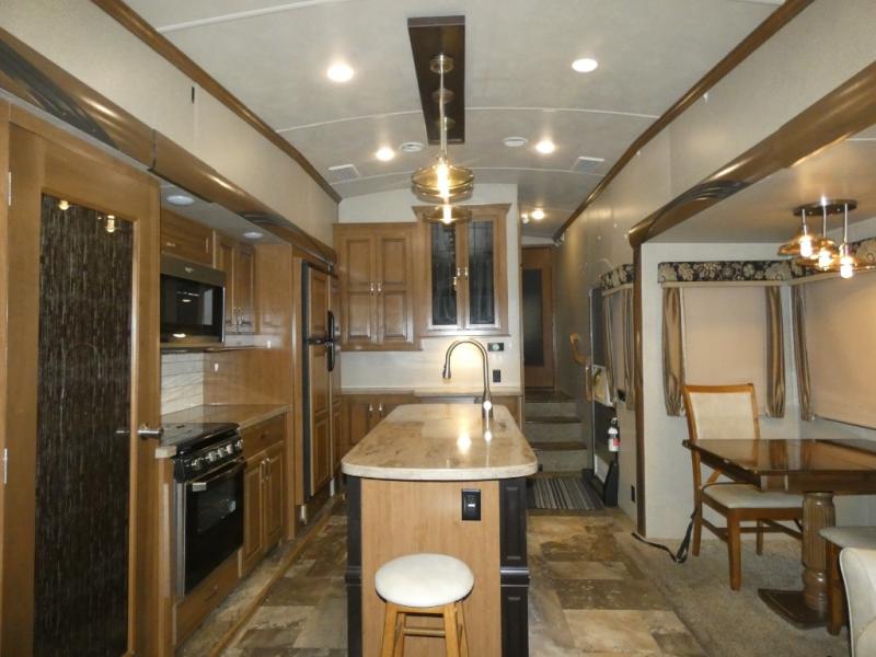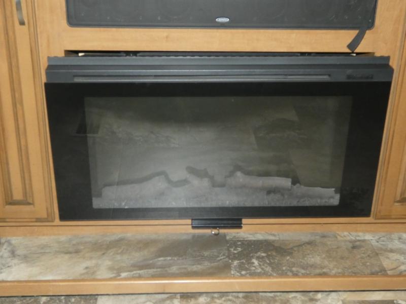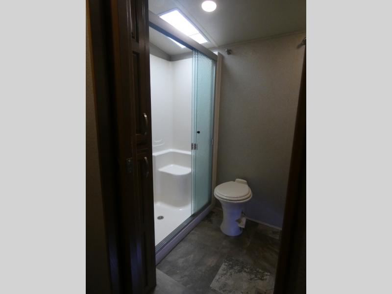 Imagine camping in your own fifth wheel at your favorite campground once a month or traveling to see new places. You don't have to leave any amenities behind when you have this model with you. In the kitchen there is plenty of work space to prepare meals when you aren't cooking over the campfire. Clean up is a breeze at the center island with the double sink. You will love the views out the panoramic window and while looking at the fireplace underneath the 50" LED TV. When you are ready to call it a day, then head up the steps to the full bathroom with Jack and Jill sinks including a full wall, back-lit mirror to the private front bedroom. The Denver king bed, and storage in the large wardrobe and a dresser should accommodate all your needs.