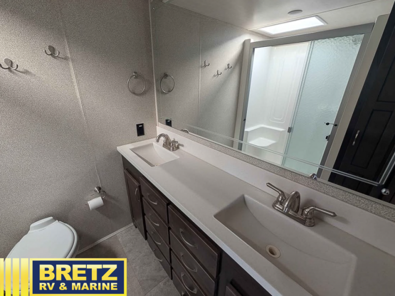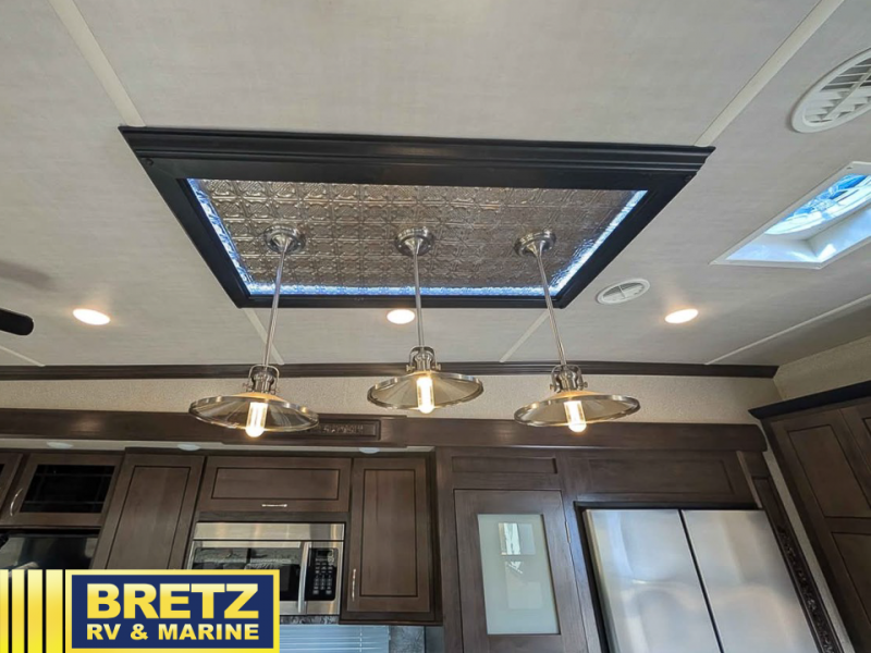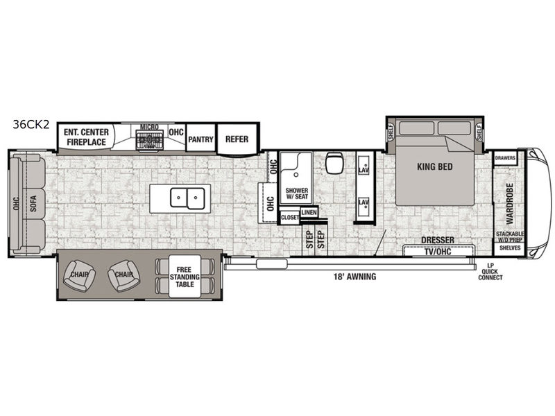 Imagine camping in your own fifth wheel at your favorite campground once a month or traveling to see new places. You don't have to leave any amenities behind when you have this model with you. In the kitchen there is plenty of work space to prepare meals when you aren't cooking over the campfire. Clean up is a breeze at the center island with the double sink. You will love the views out the panoramic window and while looking at the fireplace underneath the 50" LED TV. When you are ready to call it a day, then head up the steps to the full bathroom with Jack and Jill sinks including a full wall, back-lit mirror to the private front bedroom. The Denver king bed, and storage in the large wardrobe and a dresser should accommodate all your needs. This room has even been prepped for a washer and dryer if you choose to add that option, you can easily keep up with your laundry while you are away from home!