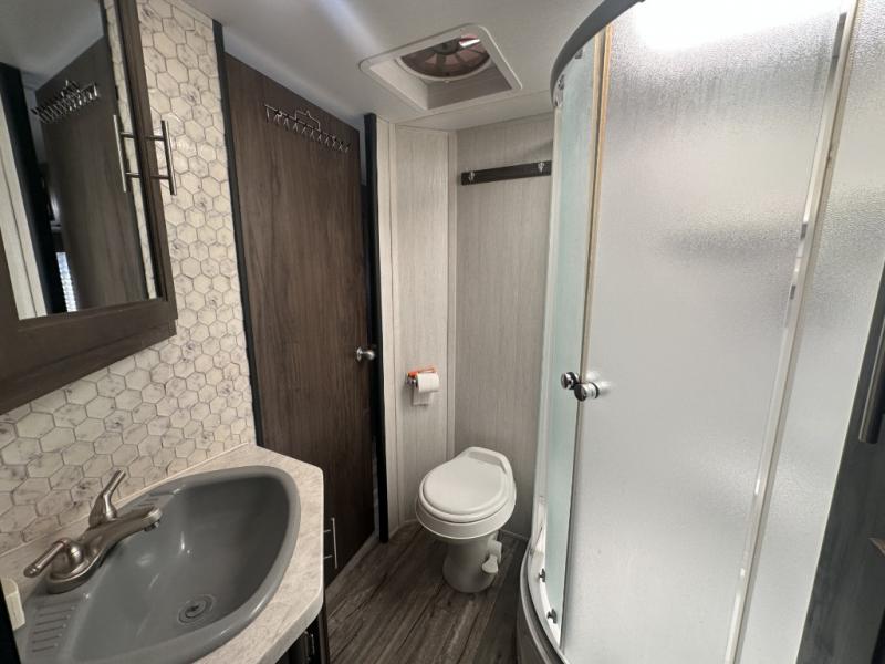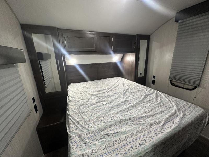 A unique feature that you will find on this Cherokee travel trailer from Forest River is the rear kitchen. You can easily entertain guests while you fix dinner and they relax or play games at the booth dinette and sofa. Additional seating can also be found on the two lounge chairs near the entry door. The bathroom has two entry doors, one from the hallway and one from the master suite. When the weather is nice, you will want to take advantage of spending more time outdoors underneath the 15' awning that will protect you from the sun and rain.