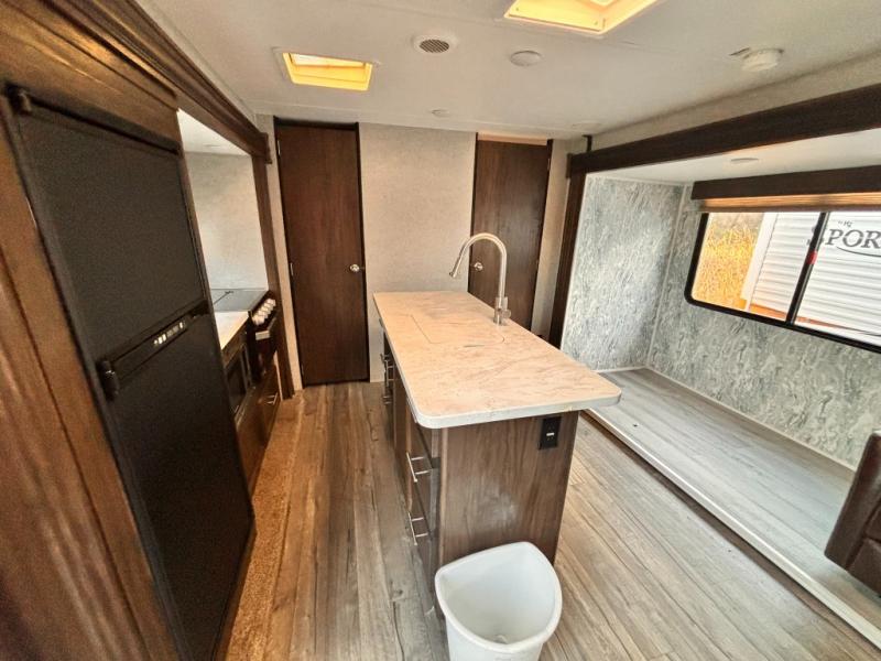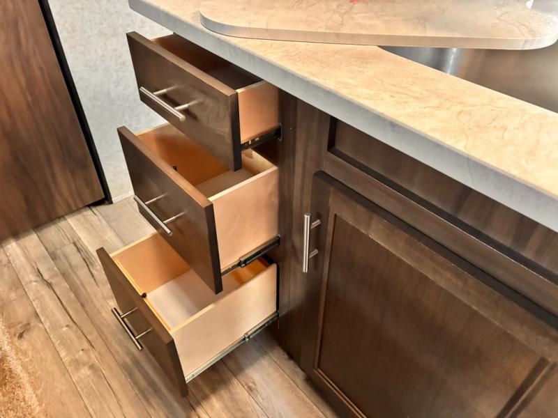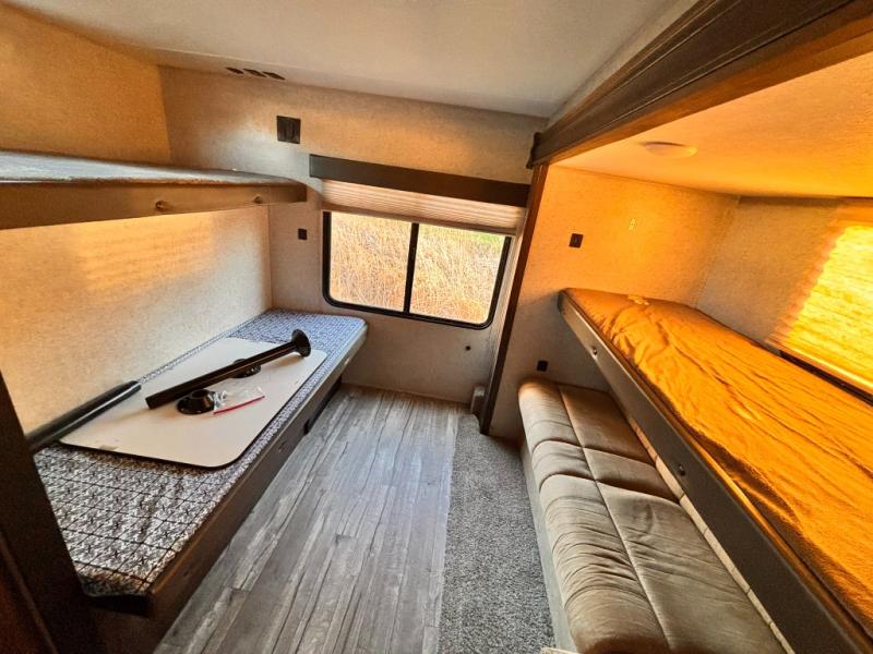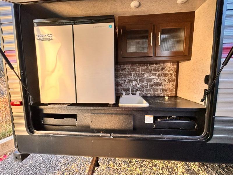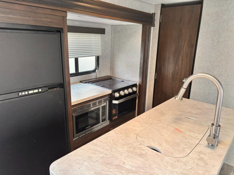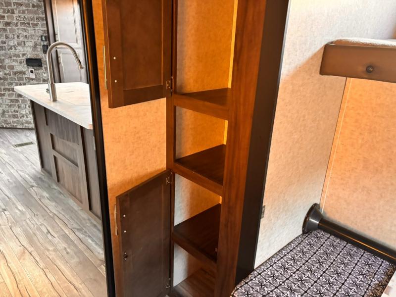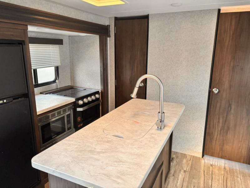 This is the ultimate family-friendly travel trailer! You will love all of the space inside this Cherokee travel trailer. From the three slides to the rear private bunkhouse for your kids, there is room for everyone and everything! The inside kitchen features a large island with a sink, plus a U-shaped dinette for you to enjoy your meals at. Throughout this model there are overhead cabinets, optional 40" storage drawers under the dinette, and exterior storage compartments. With the full outside kitchen, you can easily grab a snack from the 3.2 cu. ft. refrigerator or fix your meal on the two-burner pull-out stove top while watching your kids play.