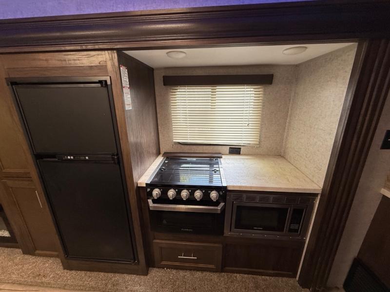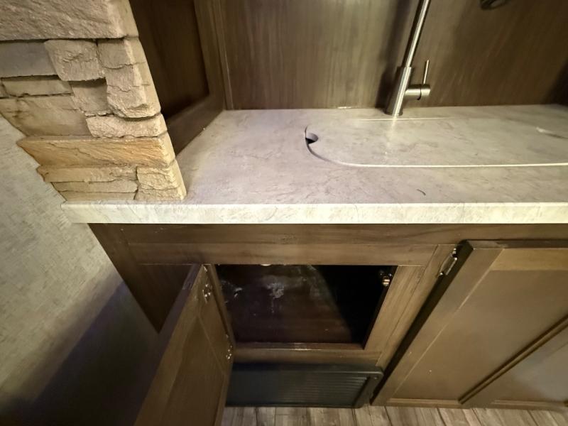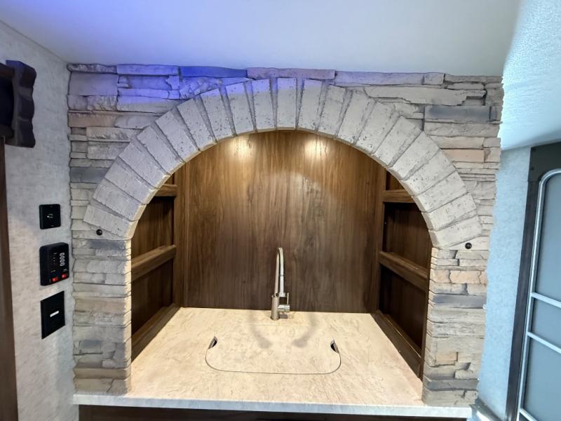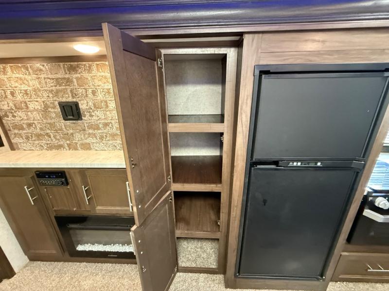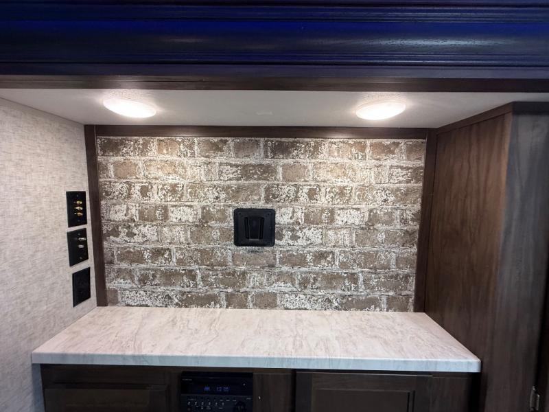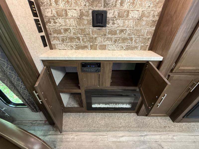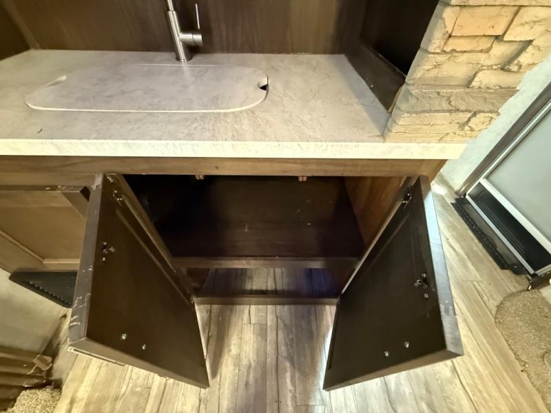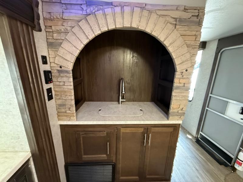 Outdoor Kitchen and Entertainment: The Cherokee 304R includes an outdoor kitchen with a grill and refrigerator, perfect for cooking meals outdoors. Additionally, the trailer is equipped with an exterior entertainment setup, ideal for relaxing under the stars.
