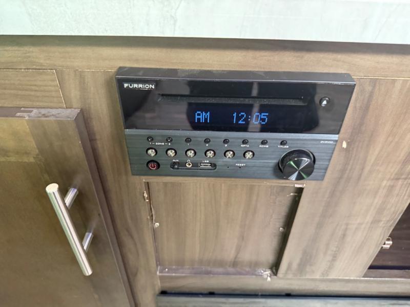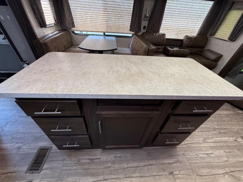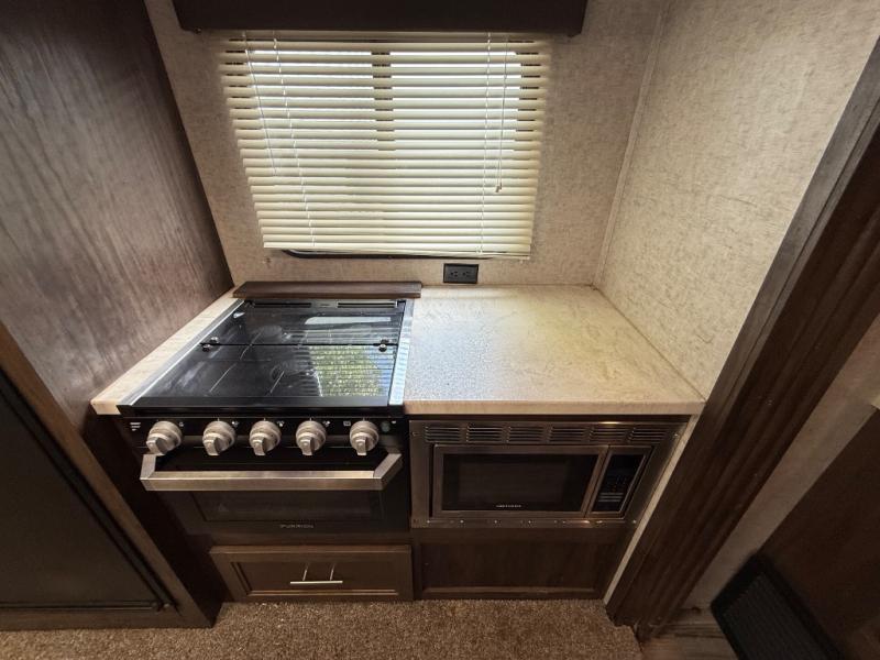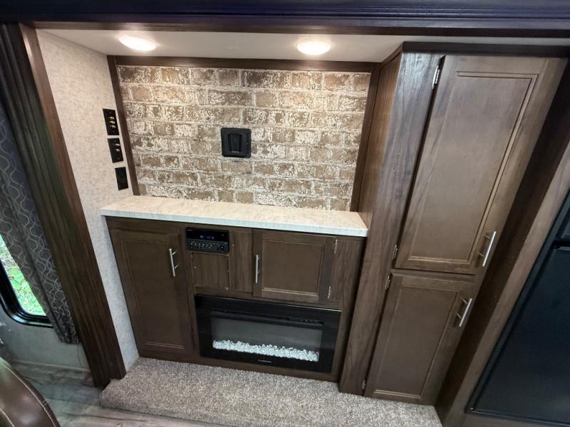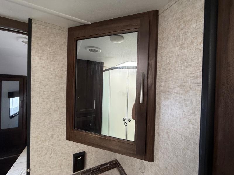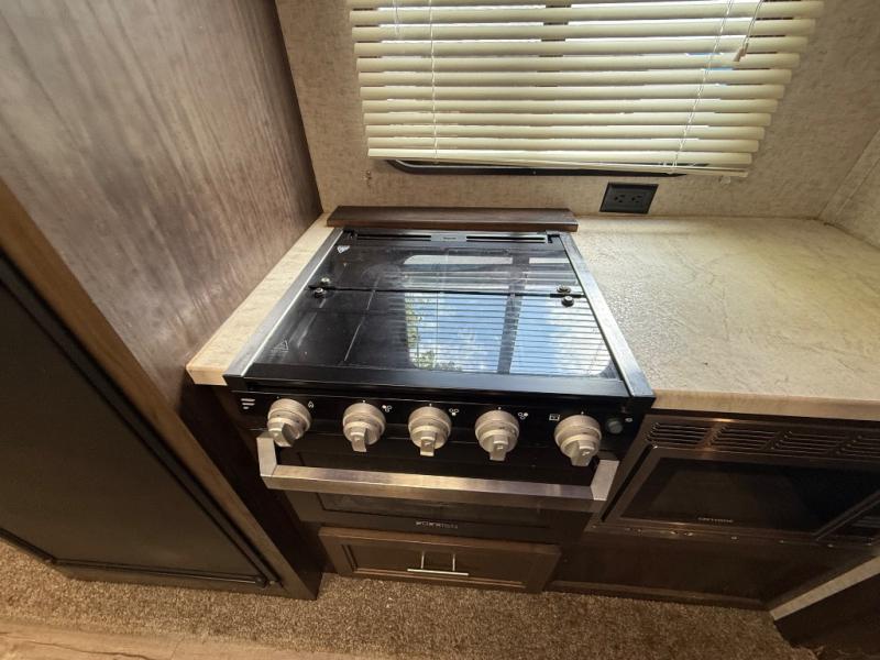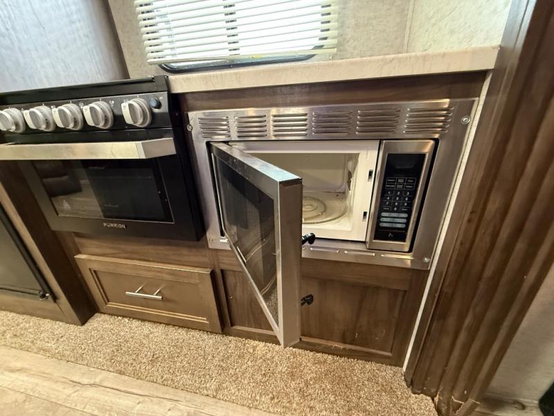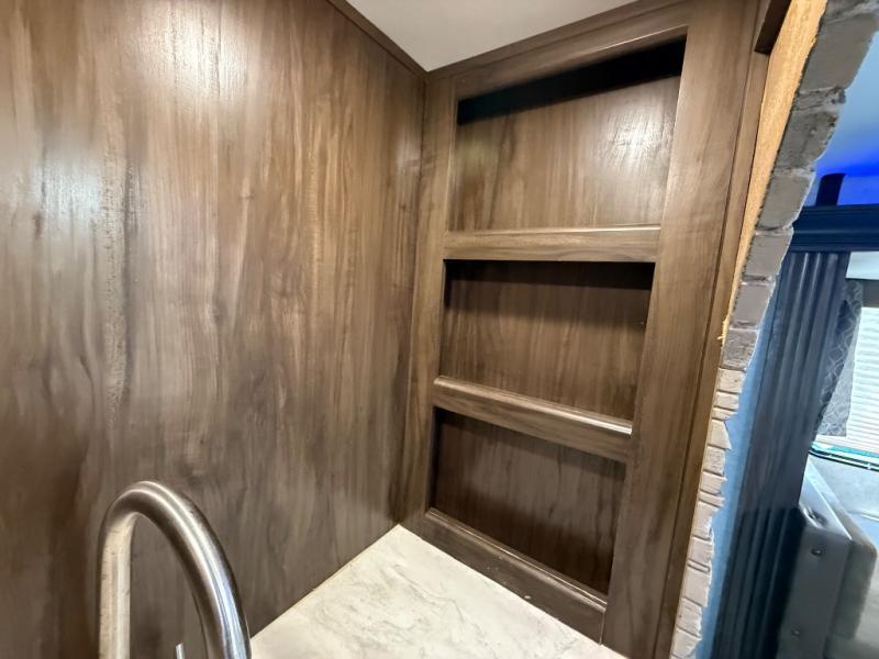 Outdoor Kitchen and Entertainment: The Cherokee 304R includes an outdoor kitchen with a grill and refrigerator, perfect for cooking meals outdoors. Additionally, the trailer is equipped with an exterior entertainment setup, ideal for relaxing under the stars.