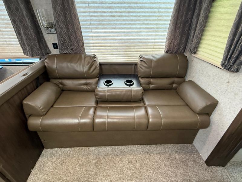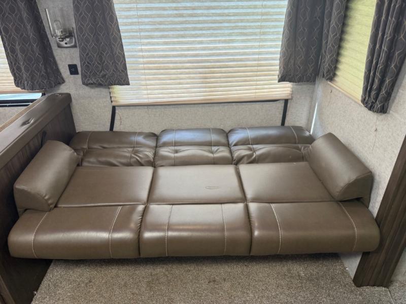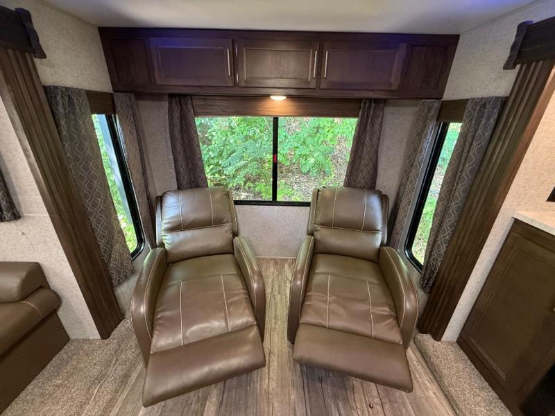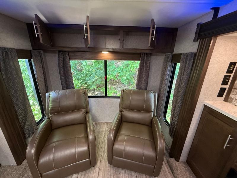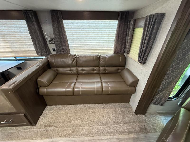 Spacious Living Area: The Cherokee 304R is designed with family-friendly layouts, offering a large living area with a comfortable sofa and an entertainment center with a flat-screen TV and sound system. The slide-out design increases the interior space, making it feel even more open.