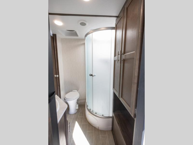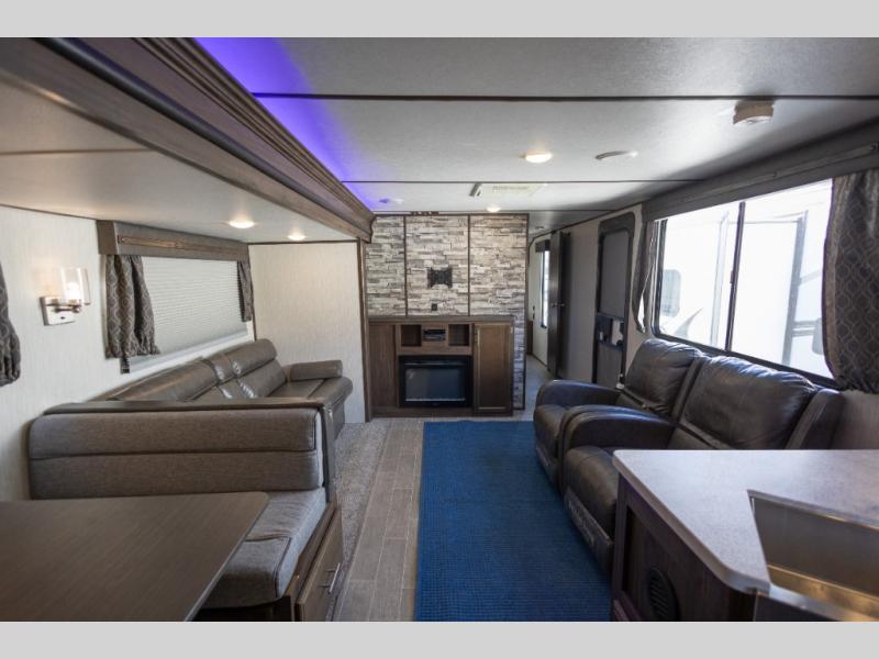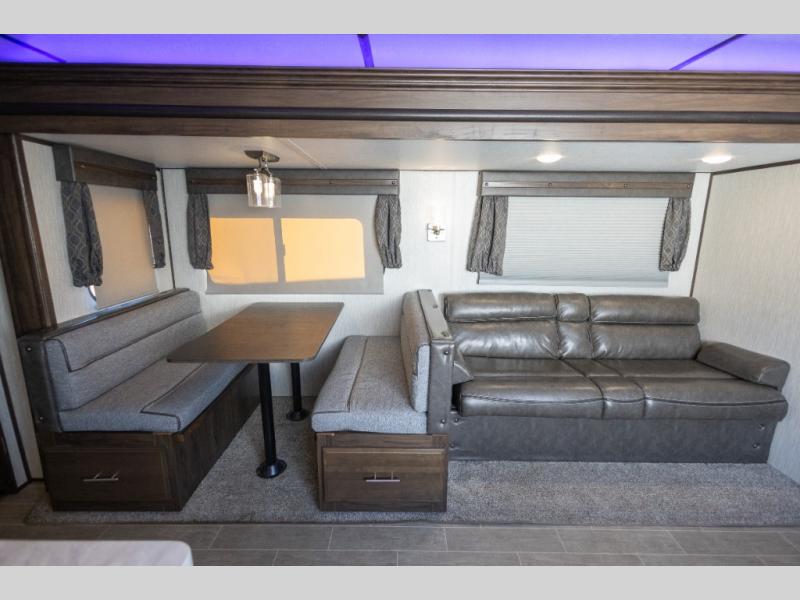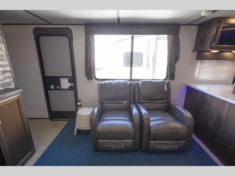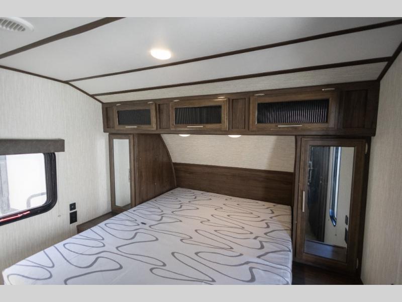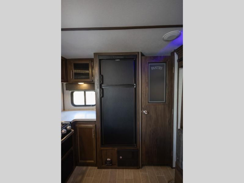 This Cherokee Alpha Wolf travel trailer is excellent for a smaller family or group of individuals who are looking to explore the country without losing the comforts of home. With a full kitchen and large pantry, you will find it easy to prepare dinner each evening, and the single slide that houses the booth dinette and sofa give you extra space to sit and chat with the chef. You will achieve complete relaxation on the queen-size bed in the front master suite, and the private bathroom entrance will allow you to quickly and conveniently get ready each morning.
