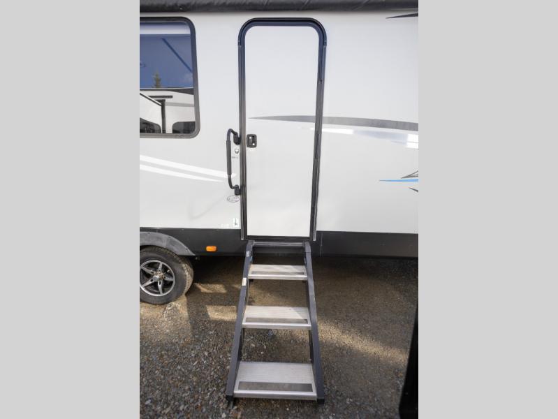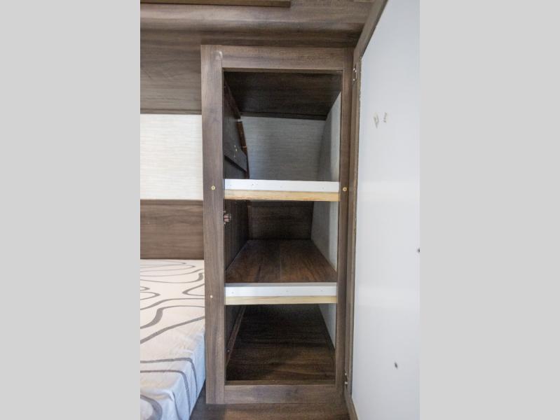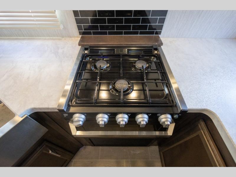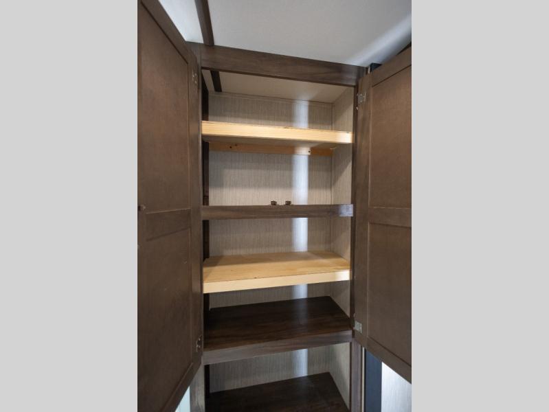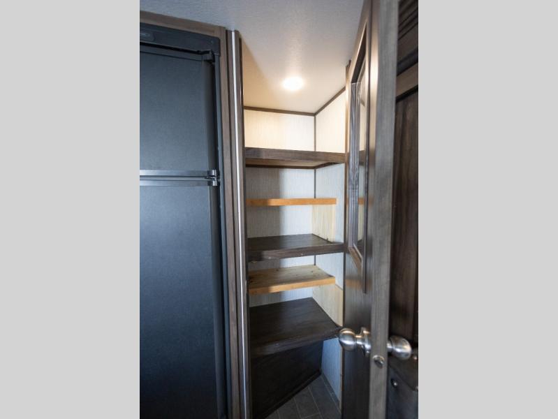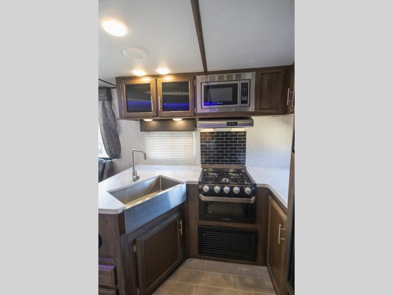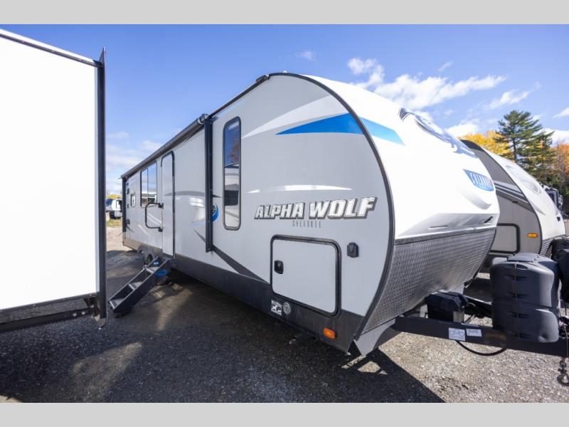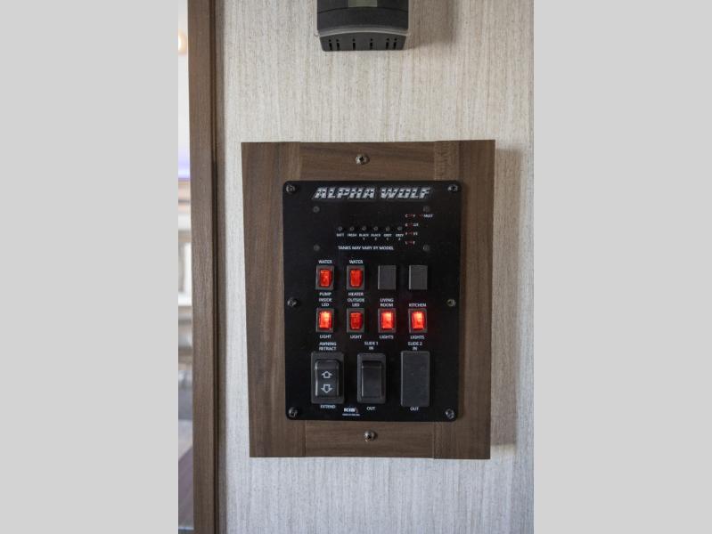 The Cherokee Alpha Wolf travel trailer is the first of Cherokee's line up to be fully laminated, which makes it lightweight, well insulated, and able to provide a sleek and modern exterior. The tire pressure monitoring system and exterior shower with hot and cold water add to the usefulness and value of the Alpha Wolf, and the LED lighting on both the exterior and interior delivers a bright and cheerful atmosphere no matter what time of day it is. Inside of the Alpha Wolf you will find stainless steel appliances in the kitchen and plenty of storage for your pots and pans underneath the sink.