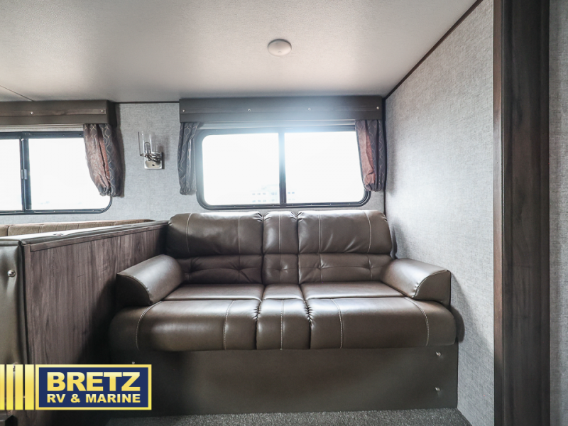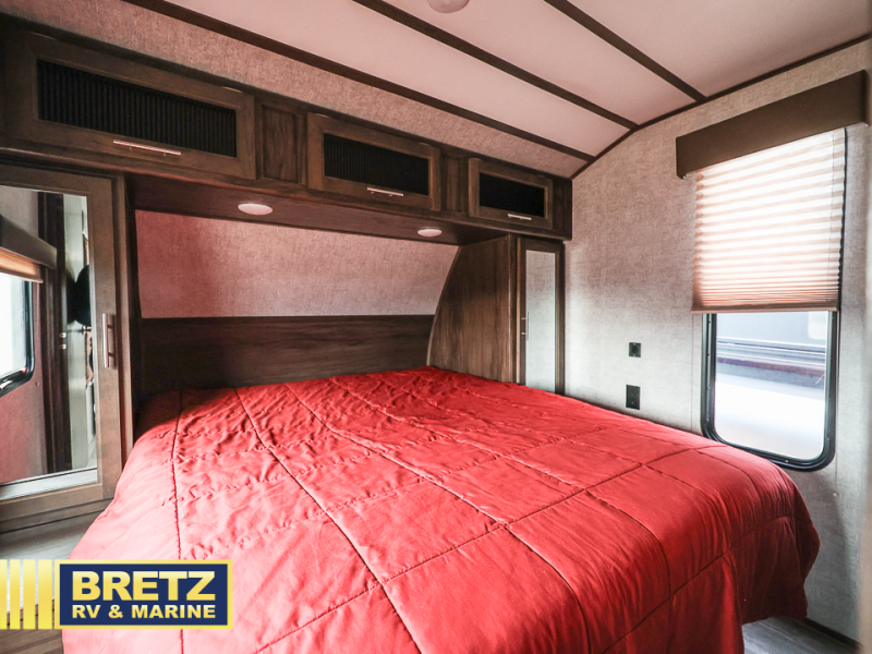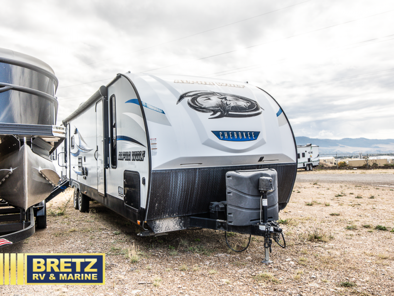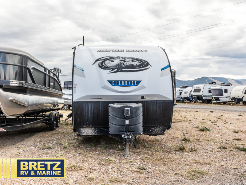 The Cherokee Alpha Wolf travel trailer is the first of Cherokee's line up to be fully laminated, which makes them lightweight, well insulated, and able to provide a sleek and modern exterior. The tire pressure monitoring system and exterior shower with hot and cold water add to the usefulness and value of the Alpha Wolf, and the LED lighting on both the exterior and interior delivers a bright and cheerful atmosphere no matter what time of day it is. Inside of the Alpha Wolf you will find stainless steel appliances in the kitchen and plenty of storage for your pots and pans underneath the sink.