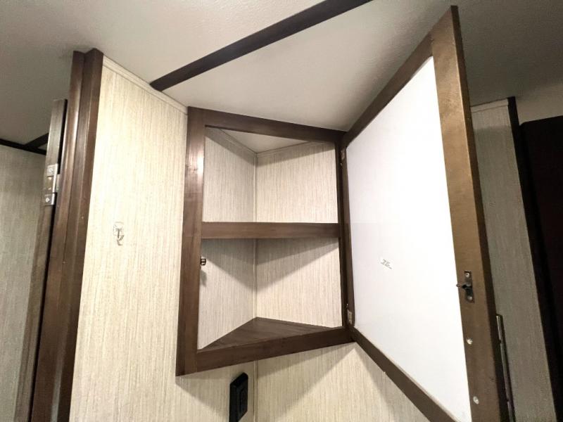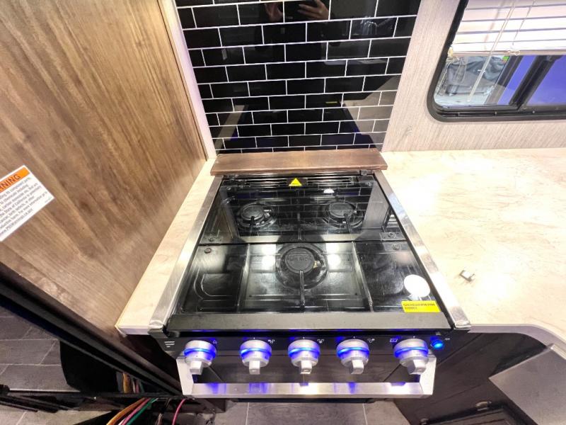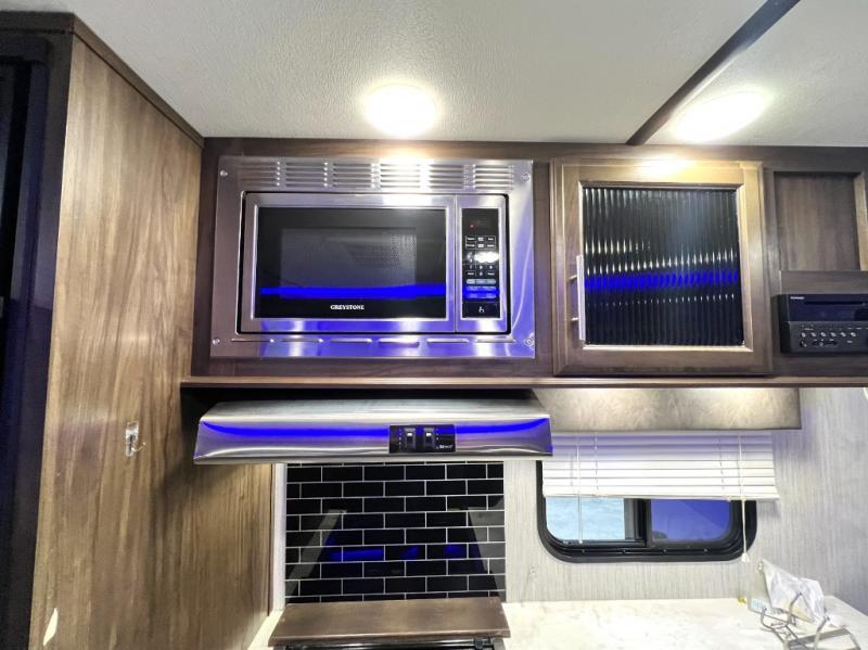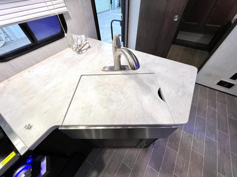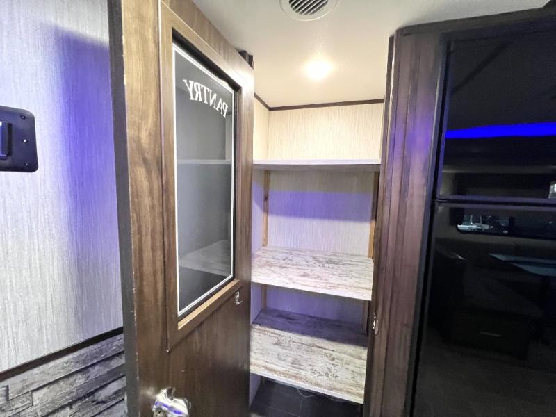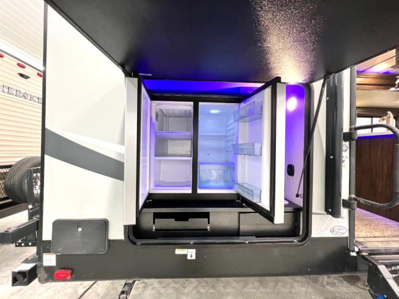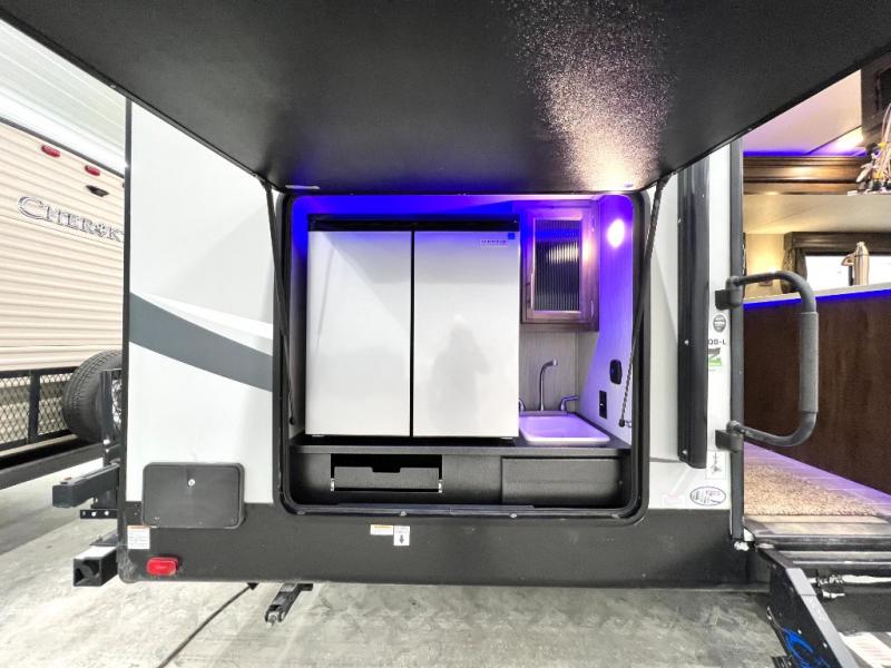 The Cherokee Alpha Wolf travel trailer is the first of Cherokee's line up to be fully laminated, which makes them lightweight, well insulated, and able to provide a sleek and modern exterior. The tire pressure monitoring system and exterior shower with hot and cold water add to the usefulness and value of the Alpha Wolf, and the LED lighting on both the exterior and interior delivers a bright and cheerful atmosphere no matter what time of day it is. Inside of the Alpha Wolf you will find stainless steel appliances in the kitchen and plenty of storage for your pots and pans underneath the sink.