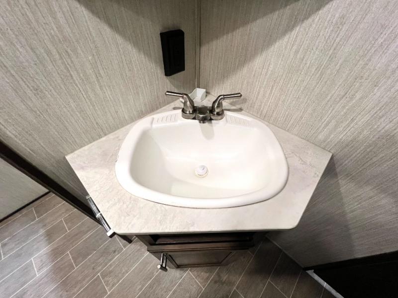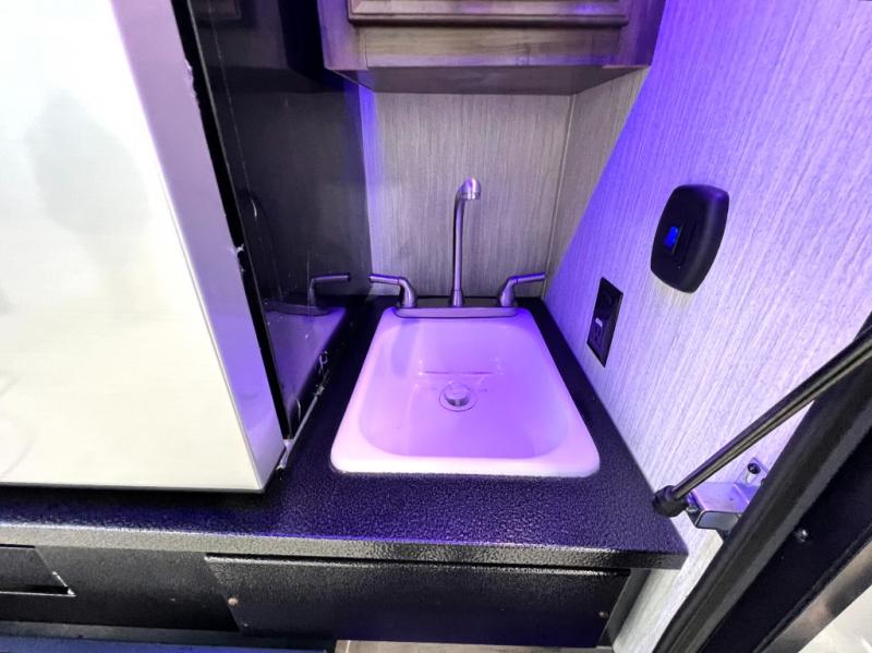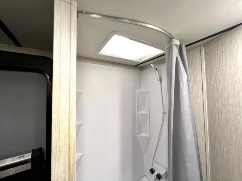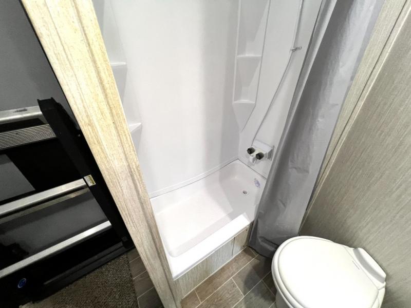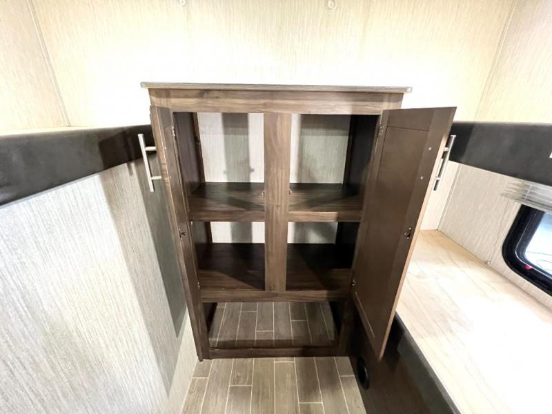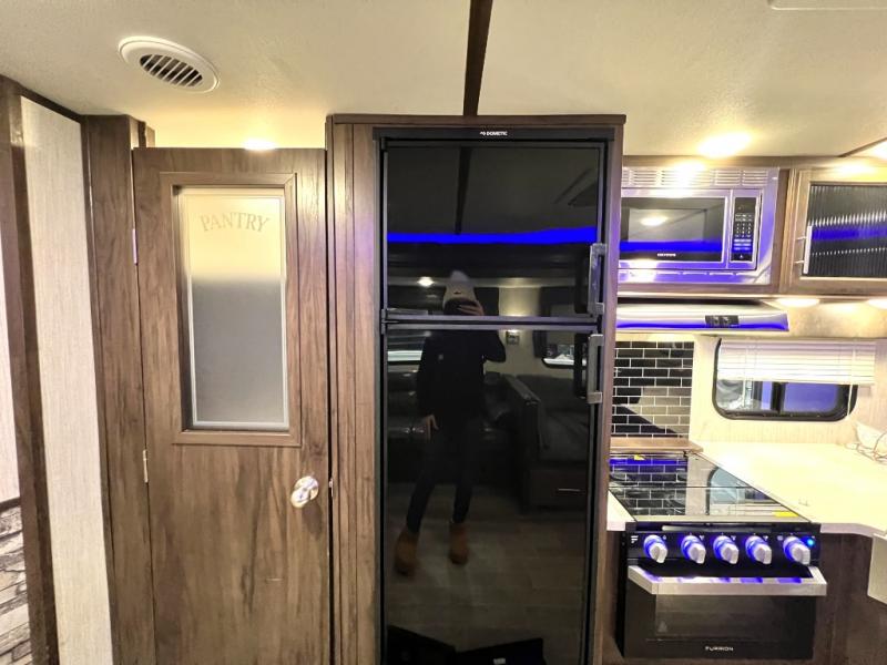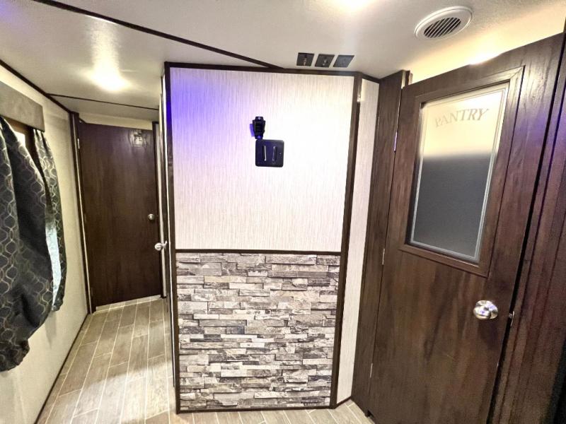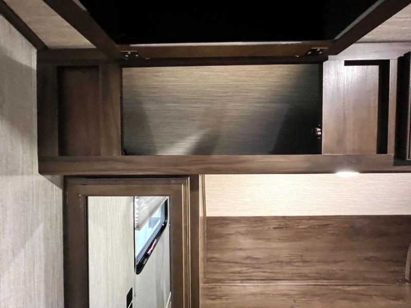 The Cherokee Alpha Wolf travel trailer is the first of Cherokee's line up to be fully laminated, which makes them lightweight, well insulated, and able to provide a sleek and modern exterior. The tire pressure monitoring system and exterior shower with hot and cold water add to the usefulness and value of the Alpha Wolf, and the LED lighting on both the exterior and interior delivers a bright and cheerful atmosphere no matter what time of day it is. Inside of the Alpha Wolf you will find stainless steel appliances in the kitchen and plenty of storage for your pots and pans underneath the sink.