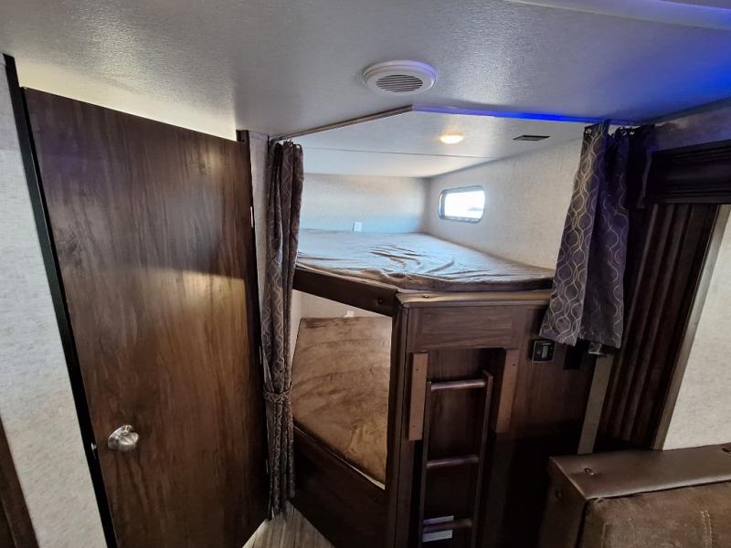Come on inside this Cherokee Grey Wolf travel trailer and experience the convenience of a smooth flow of traffic in and out with two entry doors. The rear door leads into a full bath which is great for accessibility when outside and when you need to use the bathroom. Once inside, you will notice the large U-shaped dinette and the sofa which sit on the slide and create a spacious footprint for moving about, as well as great places to play games and socialize with your friends and family. A walk-in pantry provides plenty of storage allowing you to stock up on your favorite snacks and dry goods for your family adventure. At night, there is sleeping space for ten between the double-size bunks and the queen-size bed.