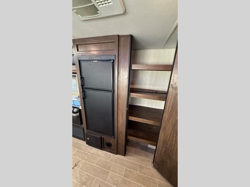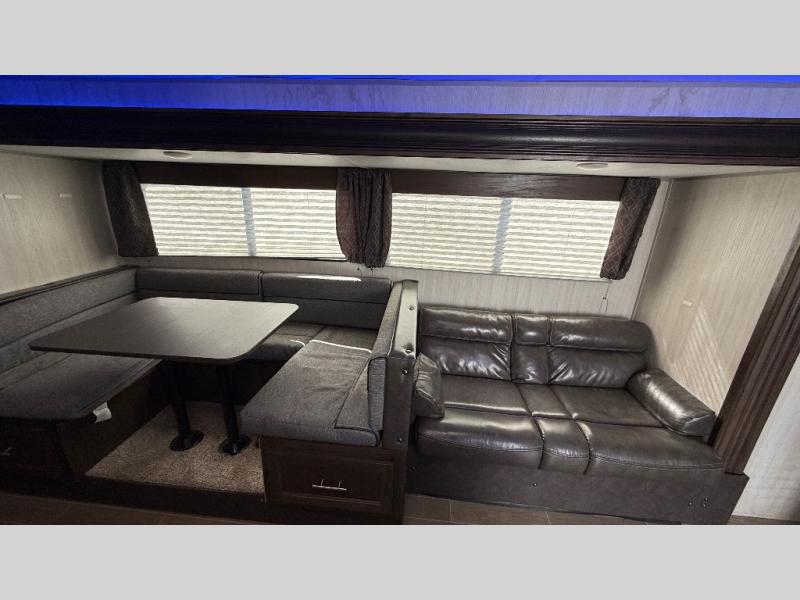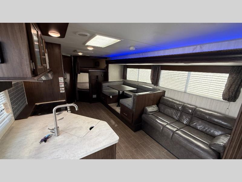 Come on inside this Cherokee Grey Wolf travel trailer and experience the convenience of a smooth flow of traffic in and out with two entry doors. The rear door leads into a full bath which is great for accessibility when outside and when you need to use the bathroom. Once inside, you will notice the large U-shaped dinette and the sofa which sit on the slide and create a spacious footprint for moving about, as well as great places to play games and socialize with your friends and family. A walk-in pantry provides plenty of storage allowing you to stock up on your favorite snacks and dry goods for your family adventure. At night, there is sleeping space for ten between the double-size bunks and the queen-size bed.