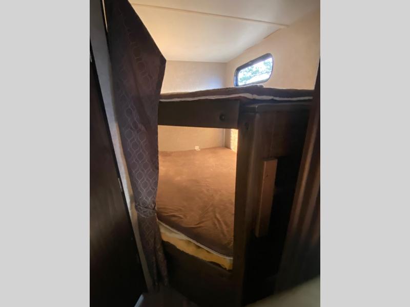 Come on inside this Cherokee Grey Wolf travel trailer and experience the convenience of a smooth flow of traffic in and out with two entry doors. The rear door leads into a full bath which is great for accessibility when outside and when you need to use the bathroom. Once inside, you will notice the large U-shaped dinette and the sofa which sit on the slide and create a spacious footprint for moving about, as well as great places to play games and socialize with your friends and family. A walk-in pantry provides plenty of storage allowing you to stock up on your favorite snacks and dry goods for your family adventure. At night, there is sleeping space for ten between the double-size bunks and the queen-size bed.