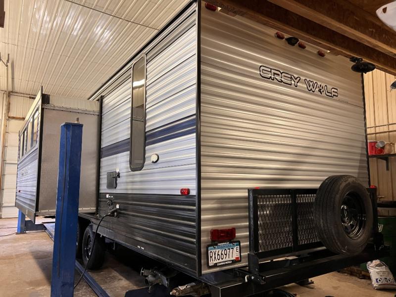 It's time you go camping the right way with this Forest River Cherokee Grey Wolf travel trailer! It features a front private bedroom with a queen bed for you to escape and recharge after a fun-filled day. Your kiddos are sure to love having their own set of rear double-size bunks with a ladder for safety, and you are sure to love that the rear corner bath is located right next to them. Inside the kitchen, there is a pantry big enough to hold your group's favorite snacks and a residential farm-style stainless steel sink to make your cleanups a breeze. There is also a U-shaped dinette for you to enjoy your meals at or play a card game or two!