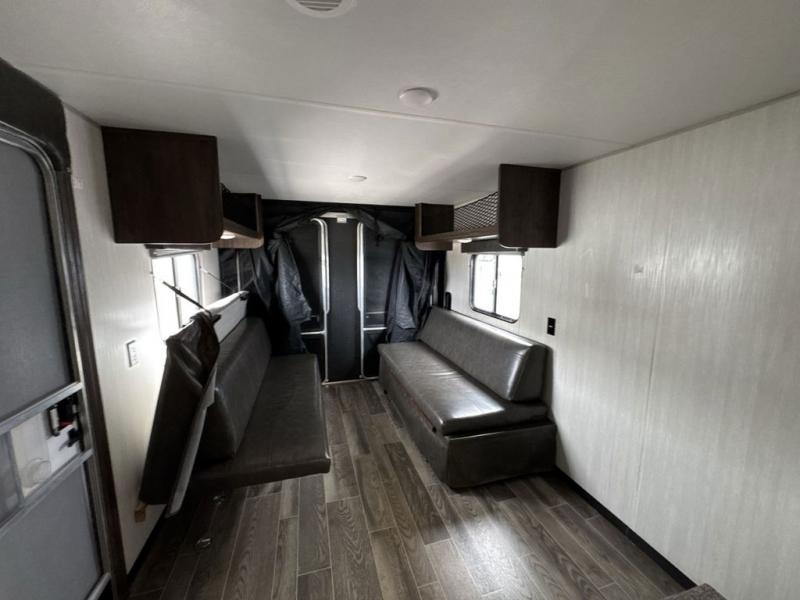This Cherokee Grey Wolf toy hauler is perfect for those who are concerned about keeping the fuel smells and grime from entering the main living area. In this unit you can enjoy the separation with a door and the walk-though bath. In the cargo area, you will have plenty of space for hauling all of your favorite toys. This area also features dual fold-down sofas with a dinette table that is great for your thrill seekers to come in for a break from riding. It also allows quick access into the bathroom without having to wander through the entire main living area where you are likely to leave a trail behind. After a full day of playing hard, you can get cleaned up and head into the main kitchen area where you will enjoy a U-shaped dinette. A full kitchen allows you to refuel your body, and there is also a queen bed up front for a great night's sleep.