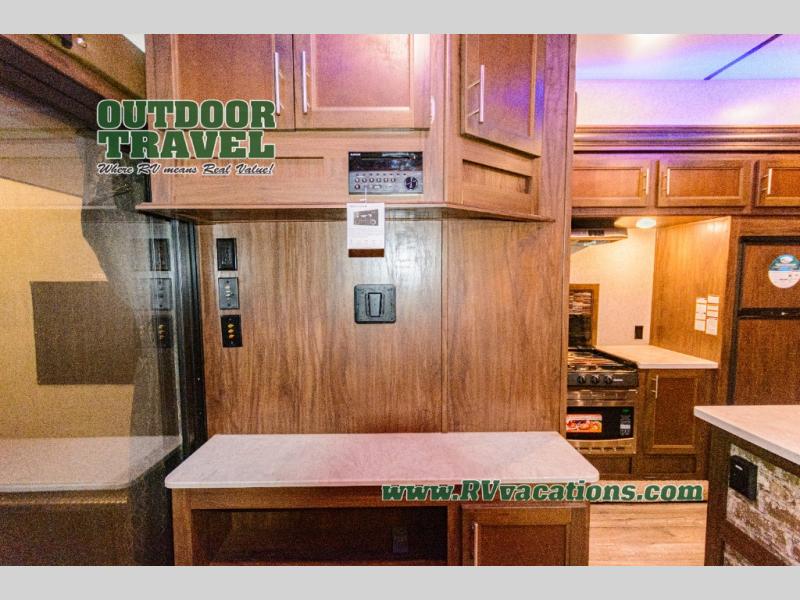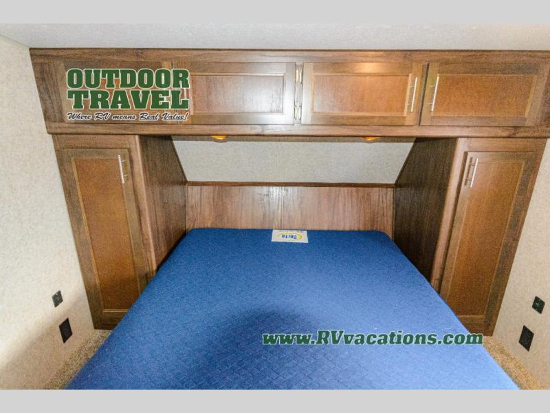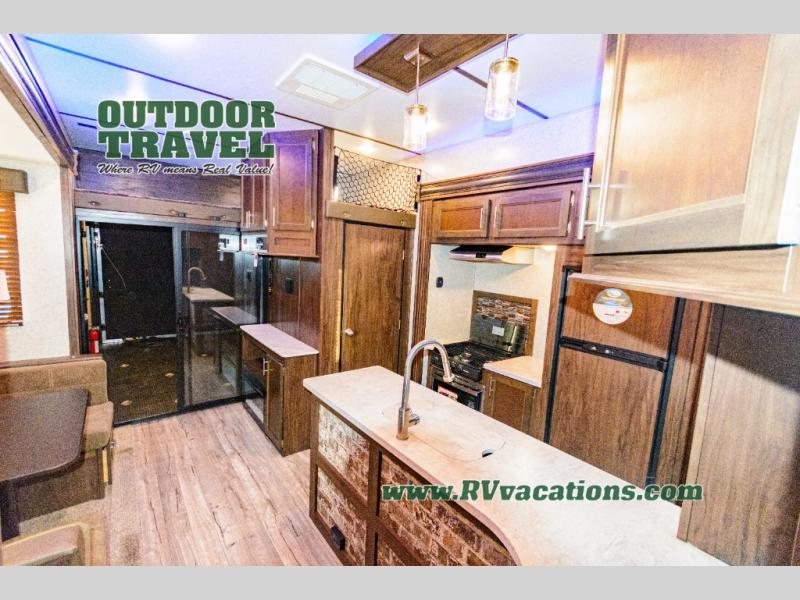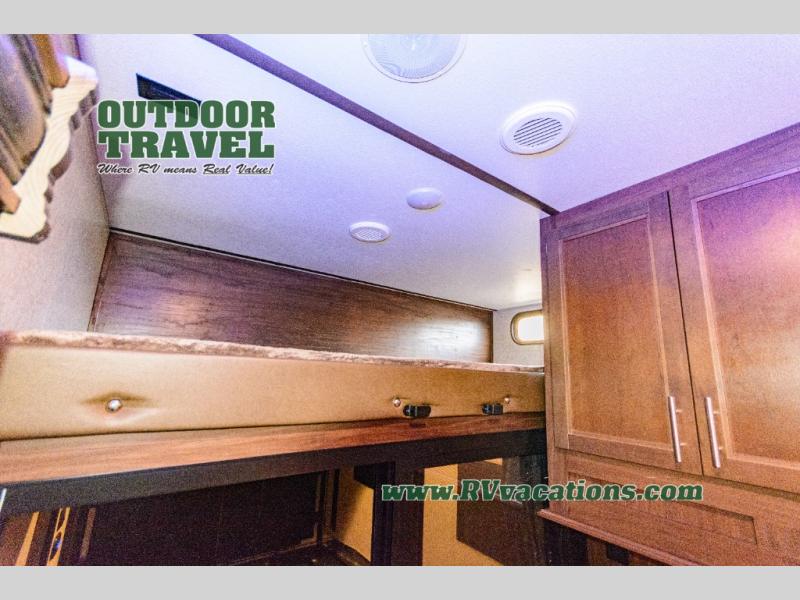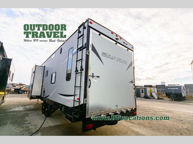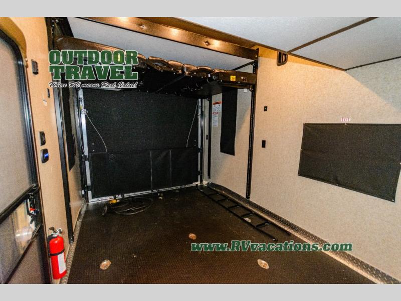 Come see just how fun and easy any camping trip can be with this double-slide Cherokee Wolf Pack toy hauler. With the 13' of cargo space, you can bring along lots of toys and camping equipment, and after your gear is unloaded, you can set up the sofa beds. Above the sofas is a Happijac power bunk which offers sleeping space for two. Off of the cargo area there is a convenient half bathroom where you can clean up before coming into the main living area. Overlooking the kitchen and living area is the loft with a queen bed. At night you can retreat to the private master suite which features a queen bed with storage below.