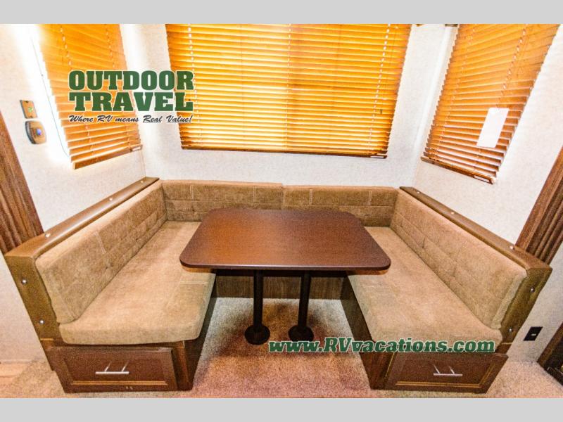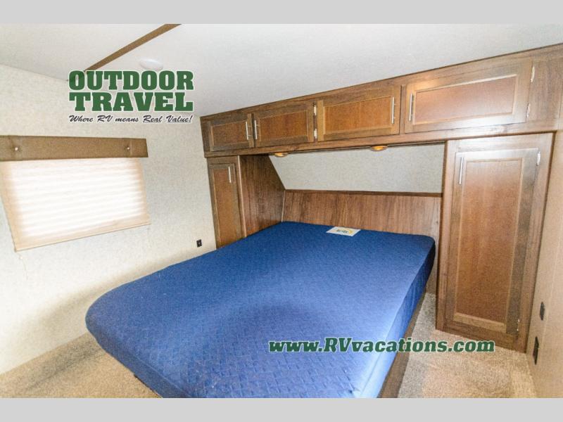 With any Cherokee Wolf Pack toy hauler, it is easy to keep the outdoor fun going all weekend long! There is plenty of room for a few dirt bikes, a four wheeler, or an ATV, and you can clean up from your excursions before coming indoors with the outside shower. Inside you will find comfortable conveniences, such as tongue and groove plywood floors, real wood doors and drawers, wood blinds, and an 8 cubic foot refrigerator. You will also appreciate having a 35,000 BTU furnace to keep the interior warm while you sleep at night.