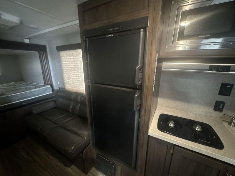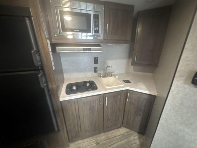 The next time you are in the market for a travel trailer, choose this Cherokee Wolf Pup. The v-nose design allows for better aerodynamics as well as gives you more floor space. This unit features a rear slide out with a queen bed to stretch out on after a long day of exploring. You'll love being able to visit with family on the sofa or share a meal at the dinette. With an overhead compartment and a pantry in the kitchen, you'll have plenty of room for all your dry goods and don't forget the outside storage for larger items! This model also includes a bath with a tub and a shower for easy clean-up. Make your next camping trip great with this Cherokee Wolf Pup travel trailer!