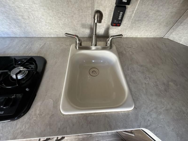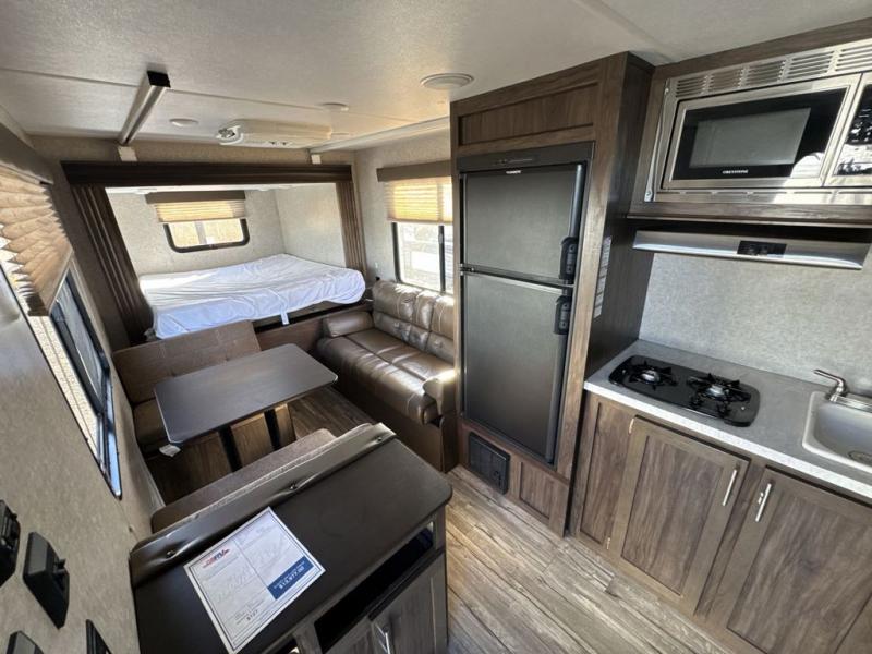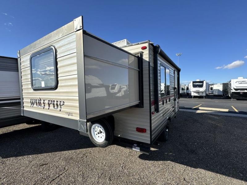 The next time you are in the market for a travel trailer, choose this Cherokee Wolf Pup. The v-nose design allows for better aerodynamics as well as gives you more floor space. This unit features a rear slide out with a queen bed to stretch out on after a long day of exploring. You'll love being able to visit with family on the sofa or share a meal at the dinette. With an overhead compartment and a pantry in the kitchen, you'll have plenty of room for all your dry goods and don't forget the outside storage for larger items! This model also includes a bath with a tub and a shower for easy clean-up. Make your next camping trip great with this Cherokee Wolf Pup travel trailer!