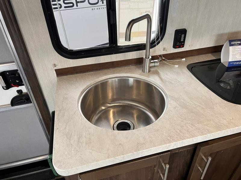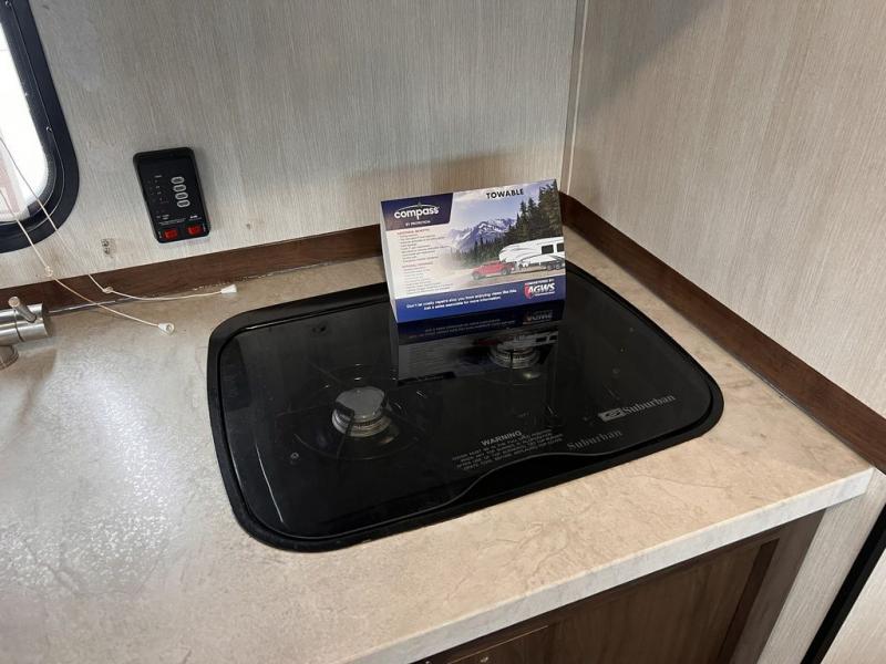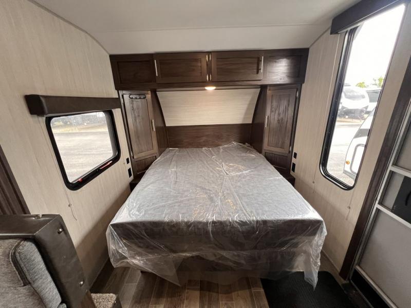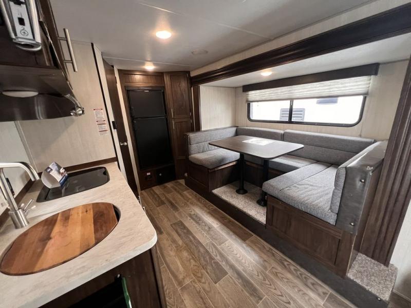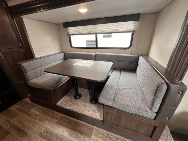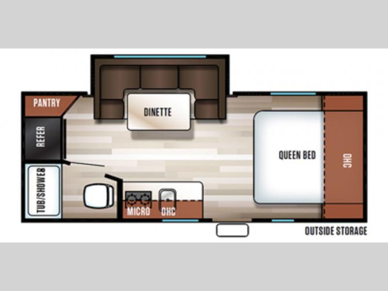 Pack up your family of four, and easily hook up this travel trailer for a camping trip you won't forget. After a day of hiking, relax on the front queen bed, and fold down the U-shaped dinette for the little ones to sleep on. This unit includes a two burner cooktop, a refrigerator, and a pantry for snacks. You'll enjoy the rear corner bath that includes a tub for the kids' bath time. Leave nothing behind with overhead storage in this model, and outside storage for the lawn chairs. This travel trailer also features a slide out for added interior space!