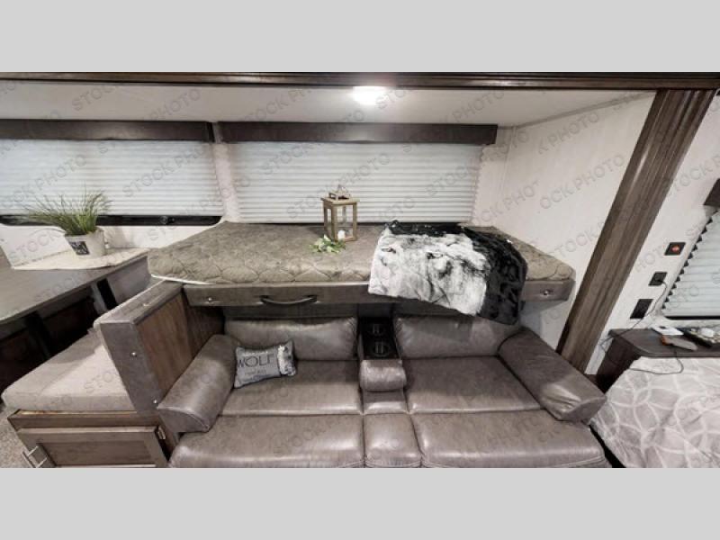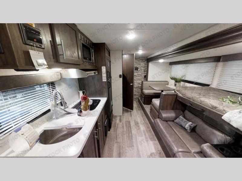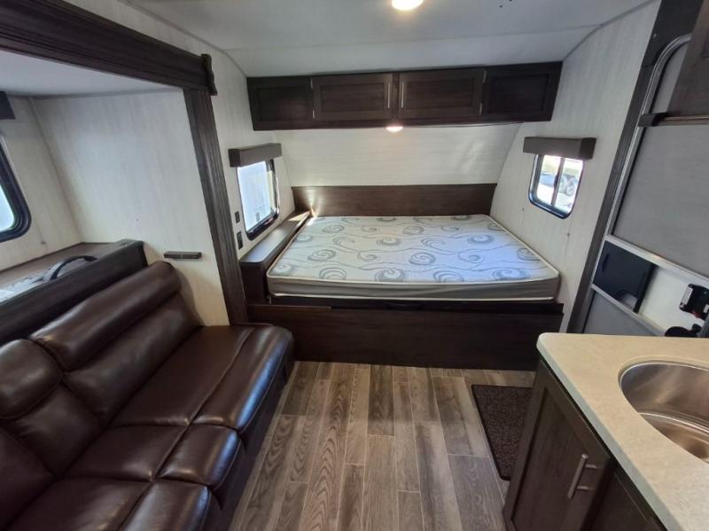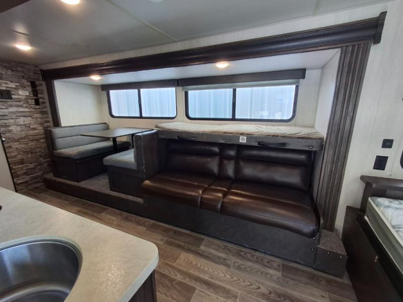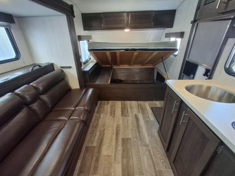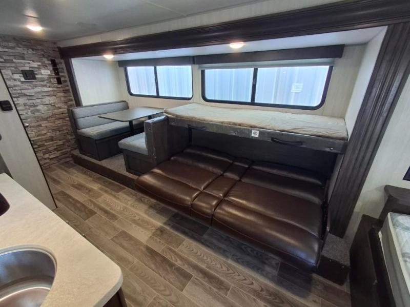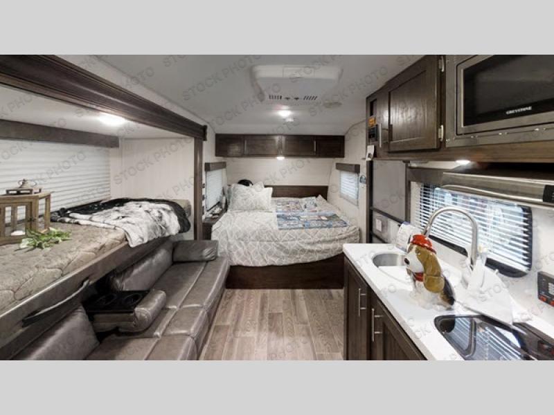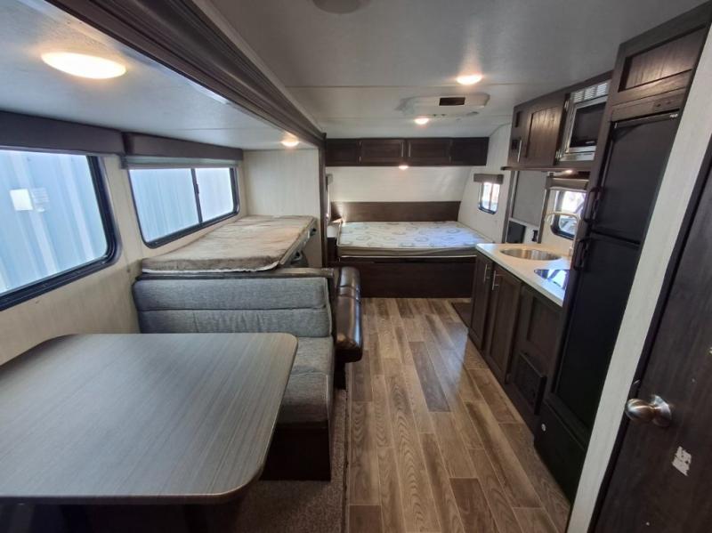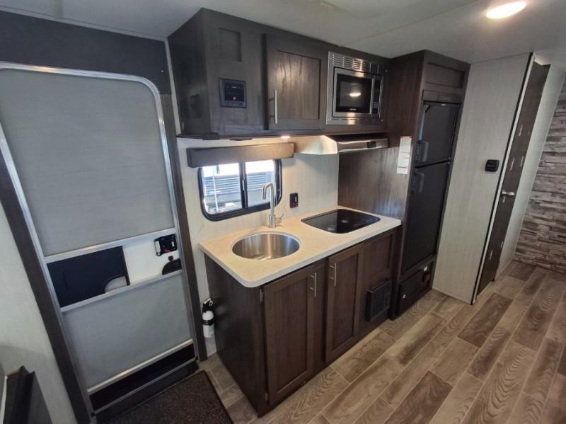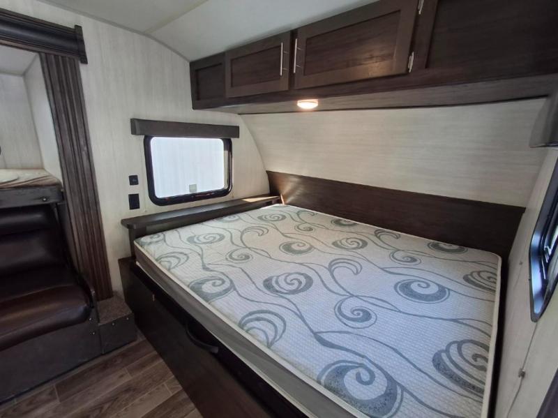 This travel trailer is perfect for your family of six. You'll love the slide out, which opens up the floor space to move around freely. Within the slide you will find a dinette and a hidden bunk above the sofa. Prepare a family dinner with a two burner cooktop in this travel trailer, as well as a microwave. This unit includes a queen bed for a good night's rest. You'll appreciate the rear corner bath for added privacy. This model also features a TV mount, which gives the fun option of bringing a TV for movie night! Make this Cherokee Wolf Pup travel trailer yours today!