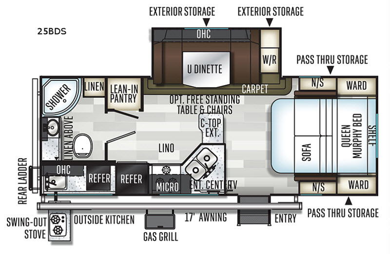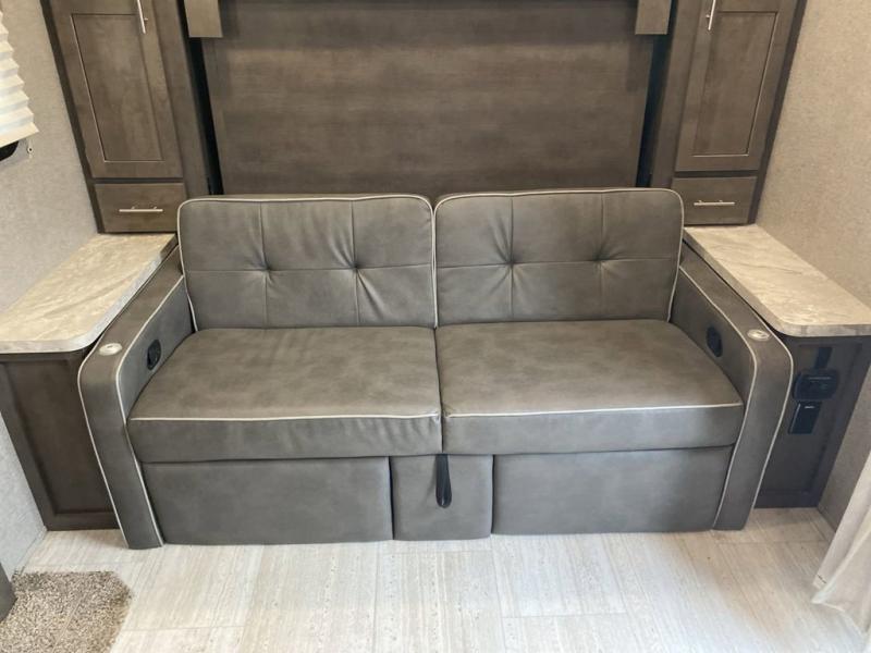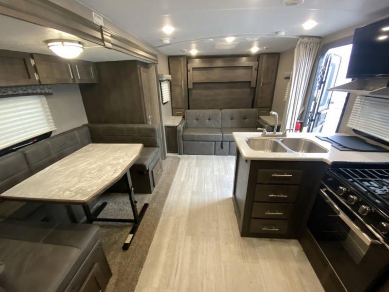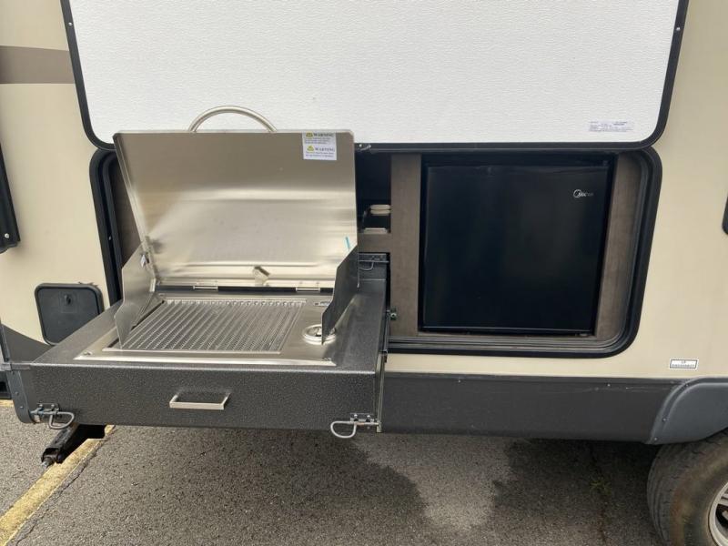 Are you ready to camp at your leisure? If so, then this travel trailer is ideal for you! There is sleeping space for four people in this unit, so you can camp with your kids or even an overnight guest or two. The single slide out opens up the floor space so you won't feel cramped. You'll enjoy a sofa in this model that conveniently converts into a Murphy bed for a good night's rest. This travel trailer features a kitchen with a three burner cooktop, a countertop extension, and a double sink which makes clean up a breeze. Enjoy the evening air when you cook outdoors using the outside kitchen that includes a two burner cooktop, a sink, and a refrigerator. This travel trailer also includes a pass through storage, exterior storage, and a rear bath for added privacy!