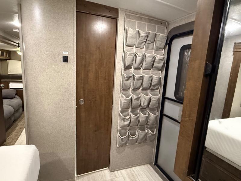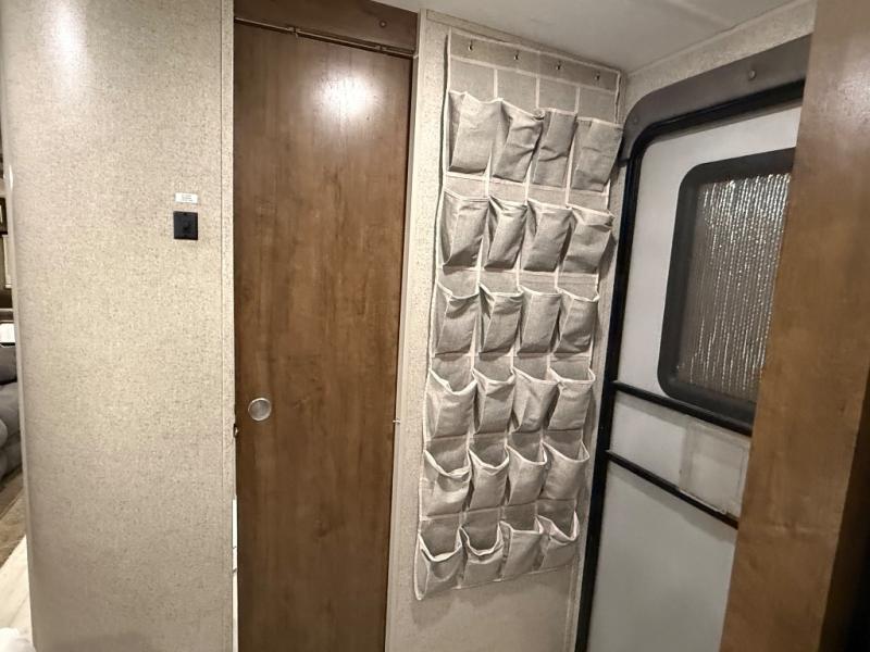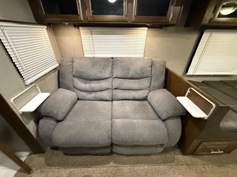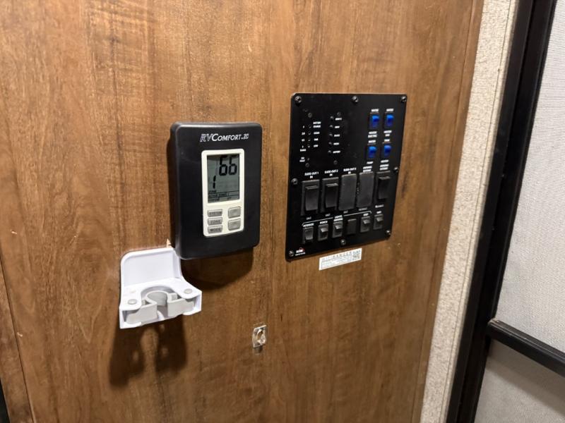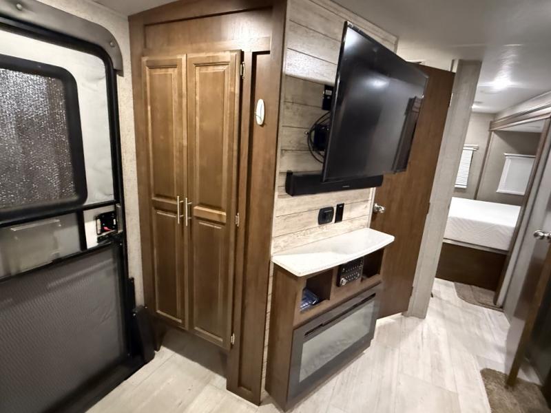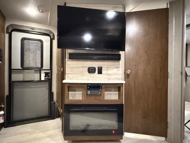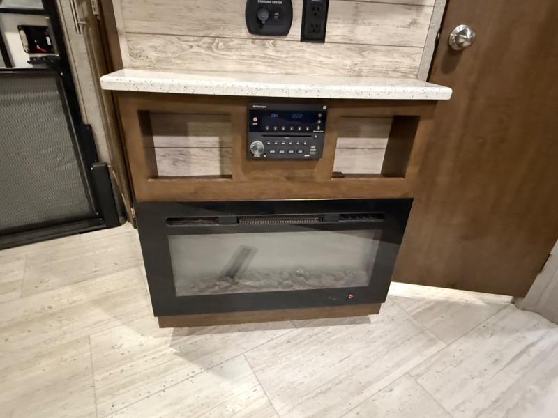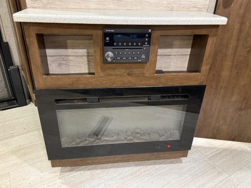 As you step inside this unit you will experience camping like never before! Just imagine a rear private bedroom with a queen Serta bed, nightstands on either side, and plenty of wardrobe space so that you can be dressed for any occasion. The double entry doors make for a smooth flow of traffic in and out of the unit. The best way to wind down your night is by grabbing a drink and lying back on the 67" hide-a-bed sofa in front of the cozy fireplace. If you want to experience the outdoors to its fullest, then get a camp chair and sit back underneath the 21' power awning with an LED light strip!