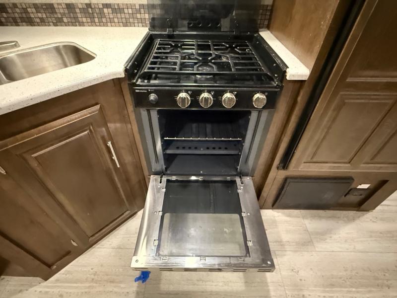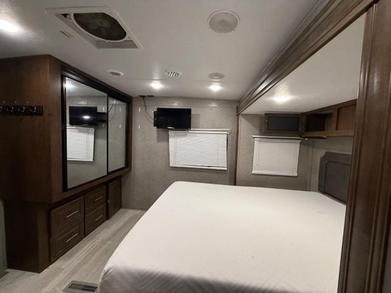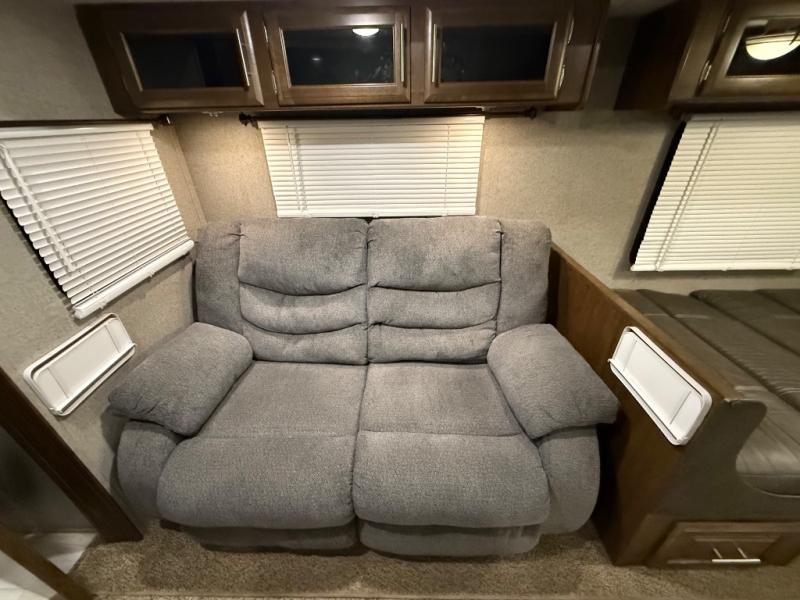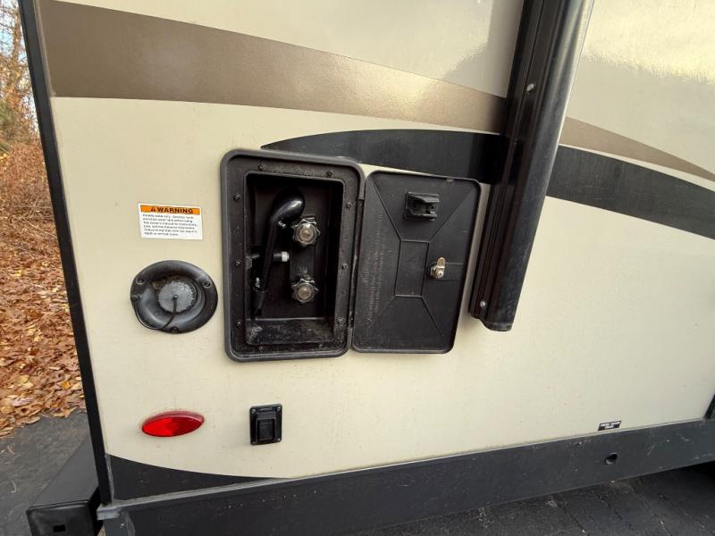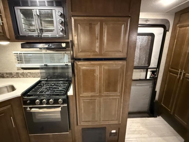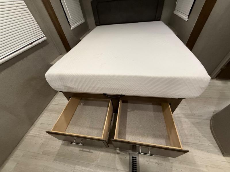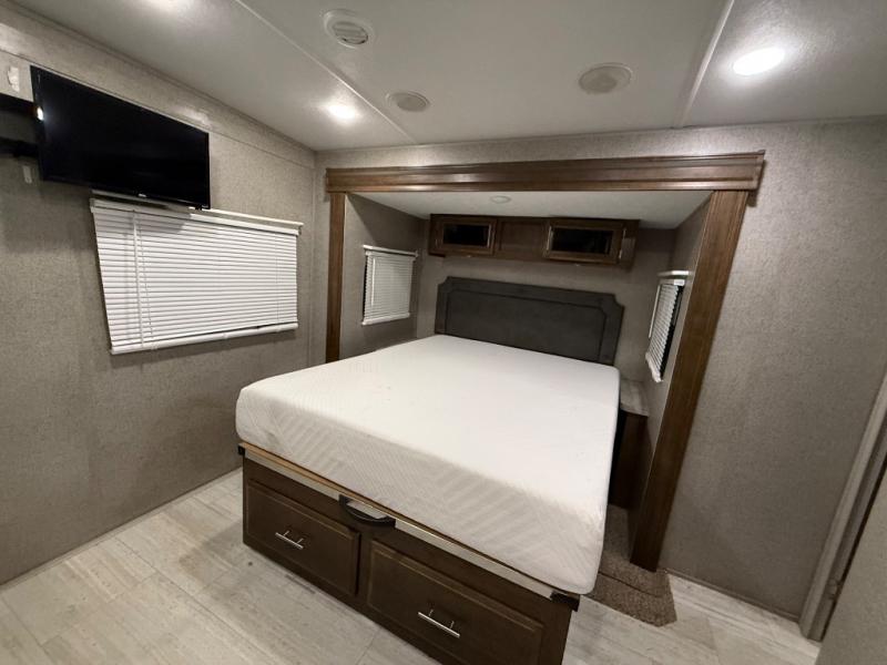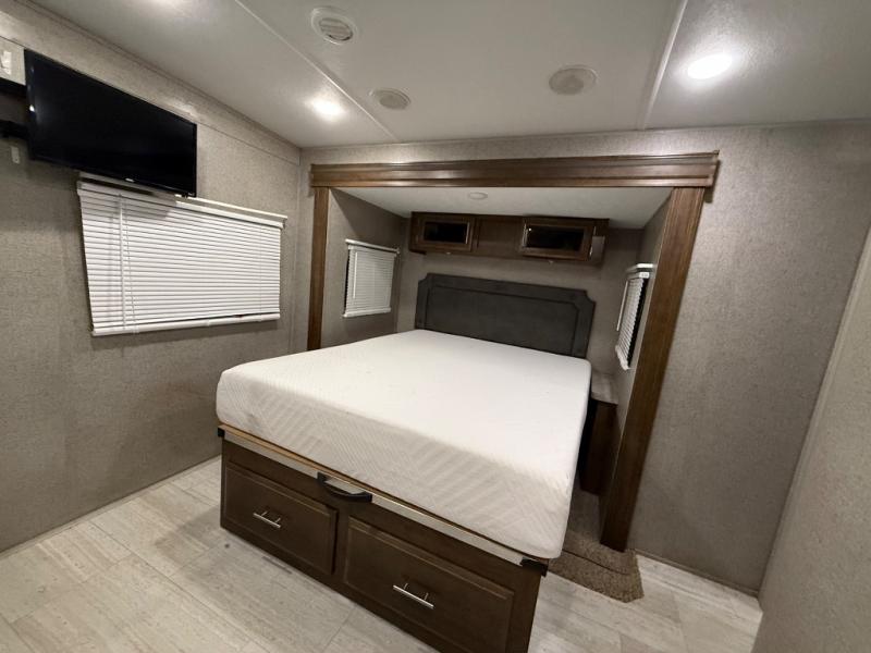 As you step inside this unit you will experience camping like never before! Just imagine a rear private bedroom with a queen Serta bed, nightstands on either side, and plenty of wardrobe space so that you can be dressed for any occasion. The double entry doors make for a smooth flow of traffic in and out of the unit. The best way to wind down your night is by grabbing a drink and lying back on the 67" hide-a-bed sofa in front of the cozy fireplace. If you want to experience the outdoors to its fullest, then get a camp chair and sit back underneath the 21' power awning with an LED light strip!