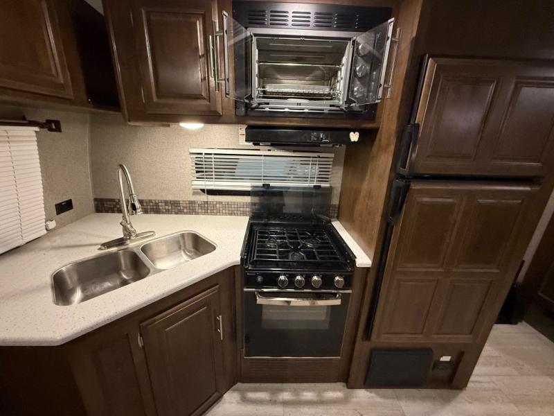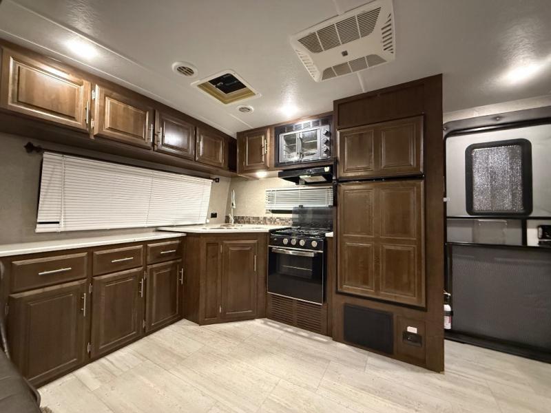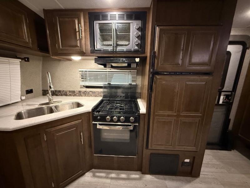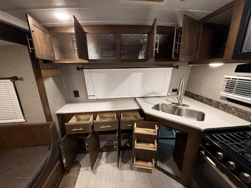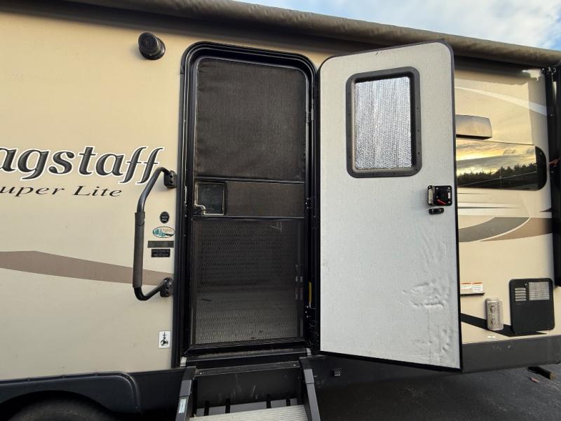 It will be easy to make plenty of memories with your family when you choose to camp with a Flagstaff Super Lite travel trailer by Forest River. These models have beautiful slatewood cabinetry with hardwood cabinet doors and drawer fronts, solid surface kitchen countertops, and ceiling LED 12 volt interior lighting. The 6 sided aluminum cage construction offers lightweight towing, the radius roof with interior vaulted ceilings give you more headroom, the WiFi ranger Wifi booster Sky 4, the enclosed underbelly, and the power awning with adjustable rain dump and LED light strip, will give you years of enjoyment!