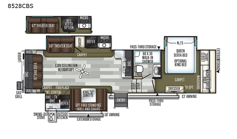 Don't pass up your chance to camp in luxury with this Forest River Classic Super Lite 8528CBS fifth wheel! It provides all of the features that you will need to feel like you're still at home while camping, plus options to add that will make it even better. Some of these features are the optional washer/dryer to keep you clean throughout your whole trip, the queen Serta bed which can be changed out for the optional king bed, and the king U-shaped dinette to enjoy your meals at. The hardest decision you will have is whether or not to cook indoors or outdoors. At the outdoor kitchen there is a swing-out stove, a refrigerator to keep your perishables fresh, and overhead cabinets to hold your cooking utensils, plus there is even an outdoor gas grill at the rear. What better way to wind down your night than to relax in front of the fireplace on either the 76" hide-a-bed sofa or the 60" theater seating which has cup holders so that you don't spill your favorite beverage!