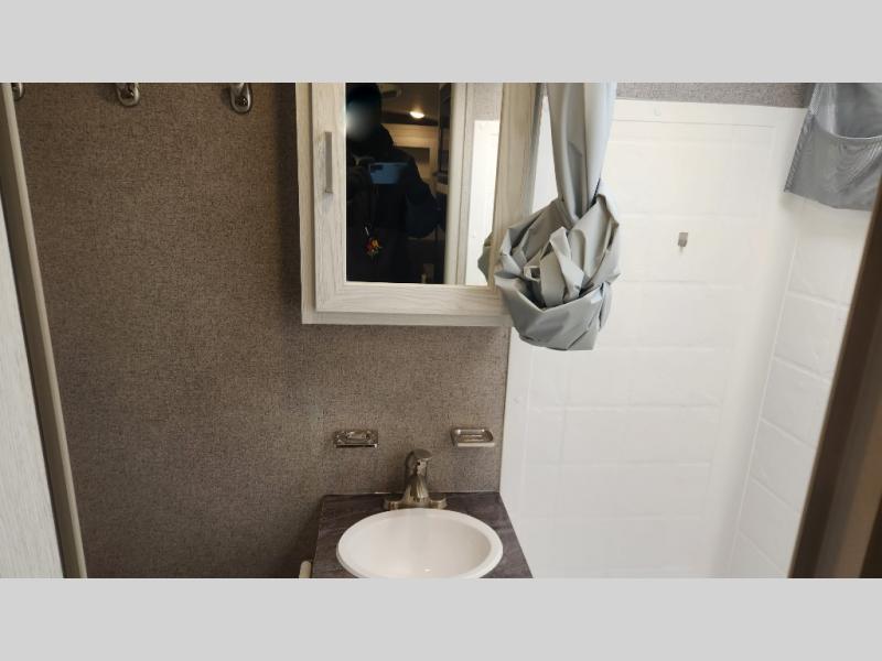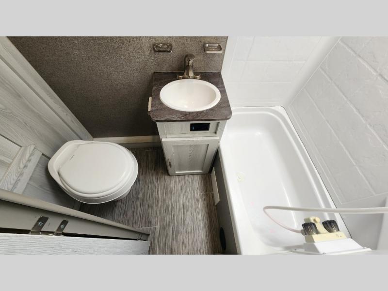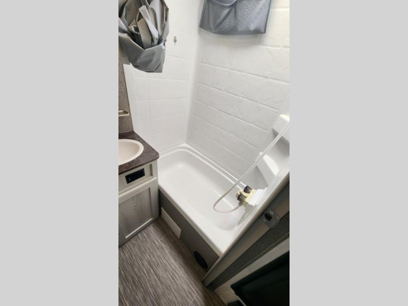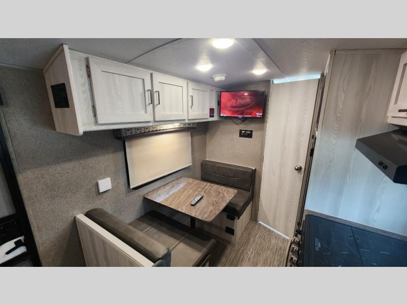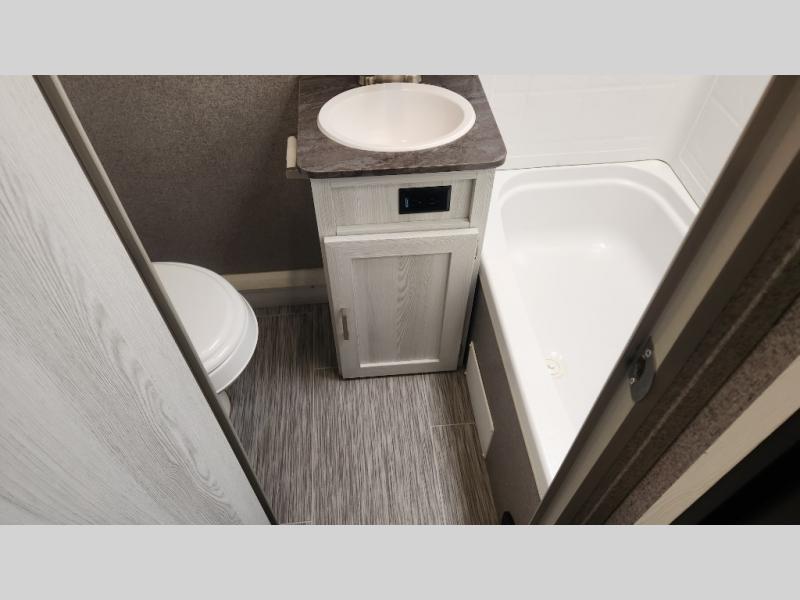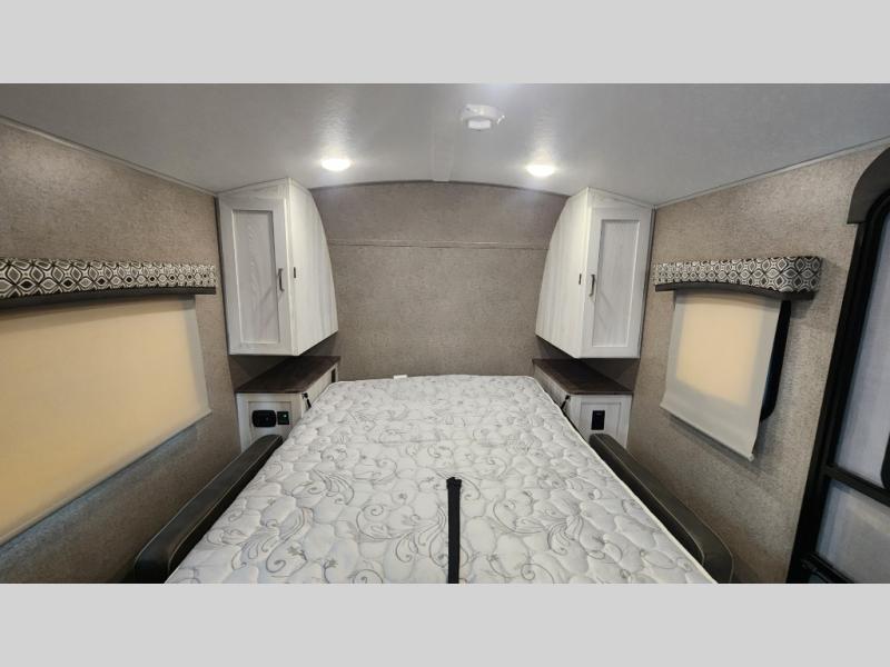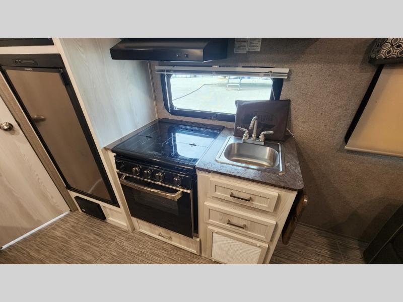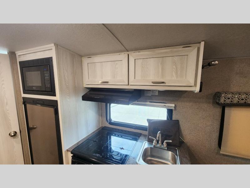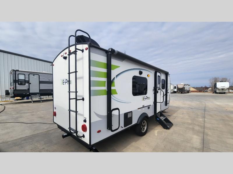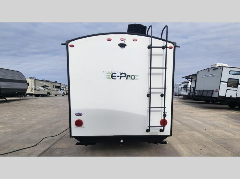 Come see just how fun and easy camping can be with this Flagstaff E-Pro travel trailer. You will find that the single slide out provides more floor space between the front and rear of the trailer to move about without having to squeeze in. The rear full bath across from the entry allows for quick access inside and outside so that you don't have to miss any of the fun. The sofa slide includes cup holders and a table for dining, working, or sleeping. The queen bed up front will allow you to unwind before the next adventure, and you can cook inside on the recessed cooktop with flush-mount cover and in the microwave or outside on the gas grill.