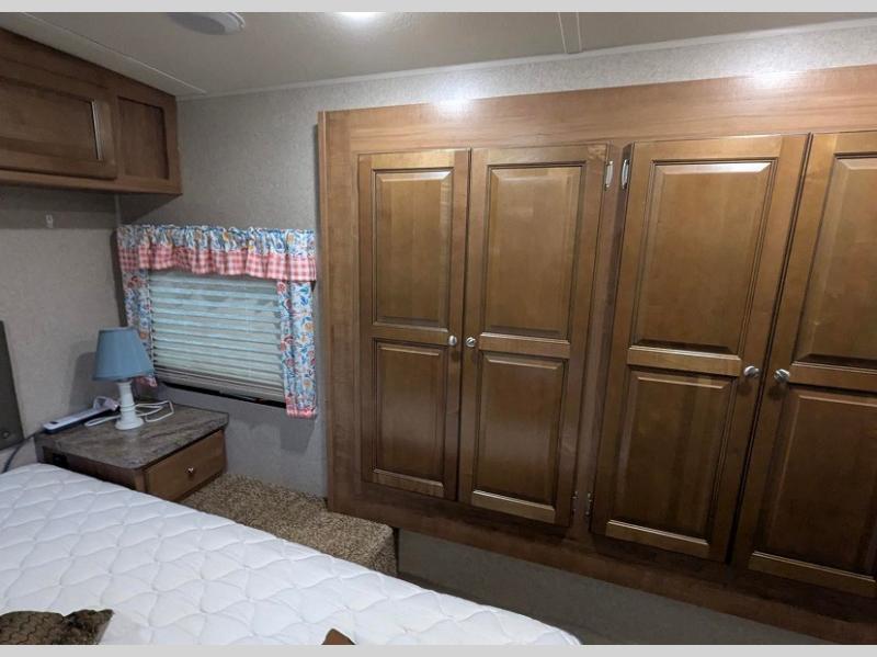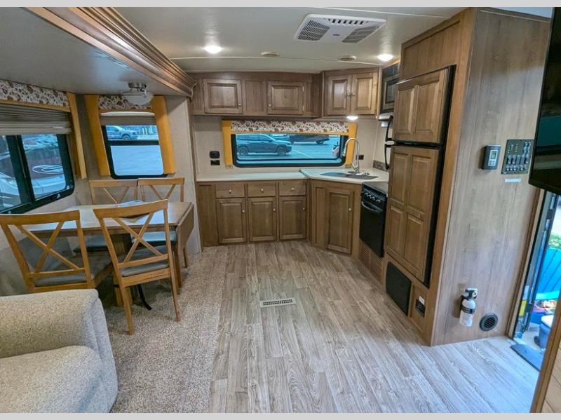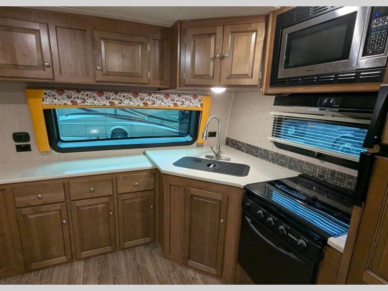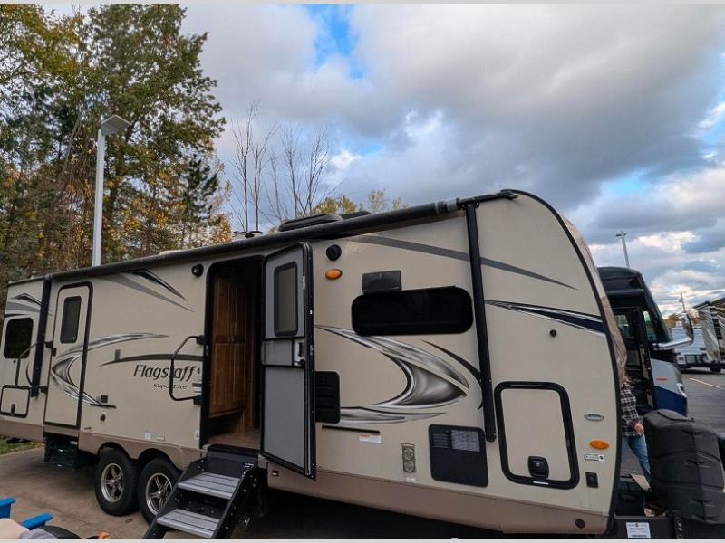 It will be easy to make plenty of memories with your family when you choose to camp with a Flagstaff Super Lite travel trailer by Forest River. These models have beautiful slatewood cabinetry with hardwood cabinet doors and drawer fronts, solid surface kitchen countertops, and ceiling LED 12 volt interior lighting. The 6 sided aluminum cage construction offers lightweight towing, the radius roof with interior vaulted ceilings give you more headroom, the WiFi ranger Wifi booster Sky 4, the enclosed underbelly, and the power awning with adjustable rain dump and LED light strip, will give you years of enjoyment!