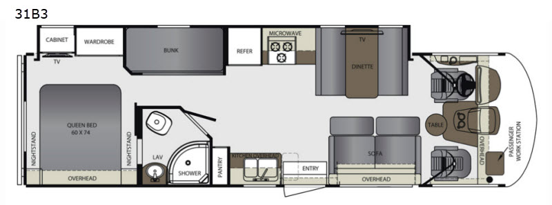 A full wall slide out and plenty of comfortable living space is what you will find in this Georgetown 3 Series GT3 31B3 class A gas motorhome by Forest River. Your kids will enjoy the bunk beds and mom and dad can get a good night's rest on the rear queen bed. For your enjoyment you can watch TV at the 40" LED TV in the living room or the 24" LED TV in the bedroom. Maybe you have a little work to do while you are away from home, well the passenger work station is the ideal spot to set up a laptop or ipad.